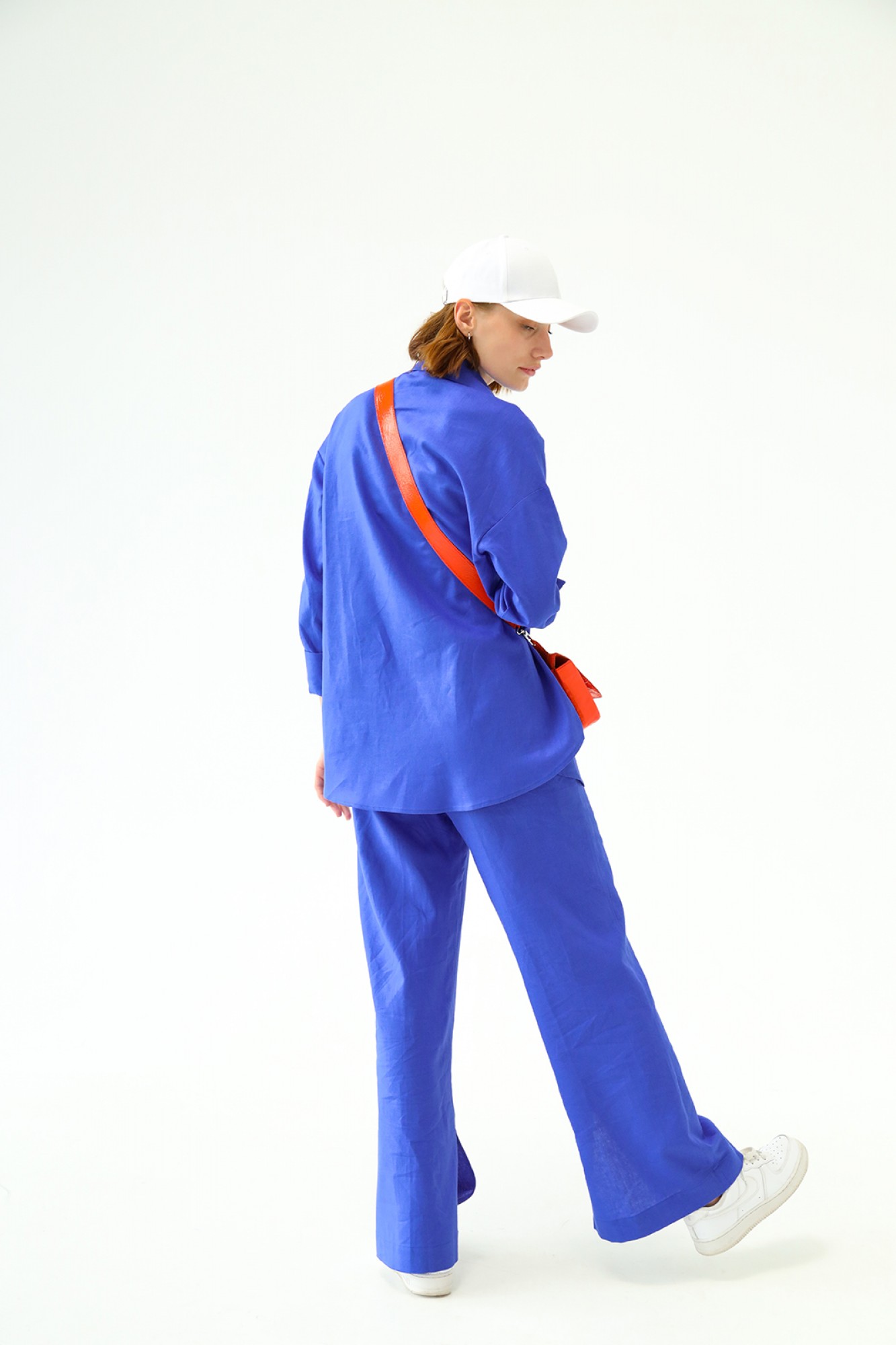 Полочка с застежкой на пуговицы по цельнокроеной планке полочки. Воротник отложной на стойке. В боковых швах разрезы.