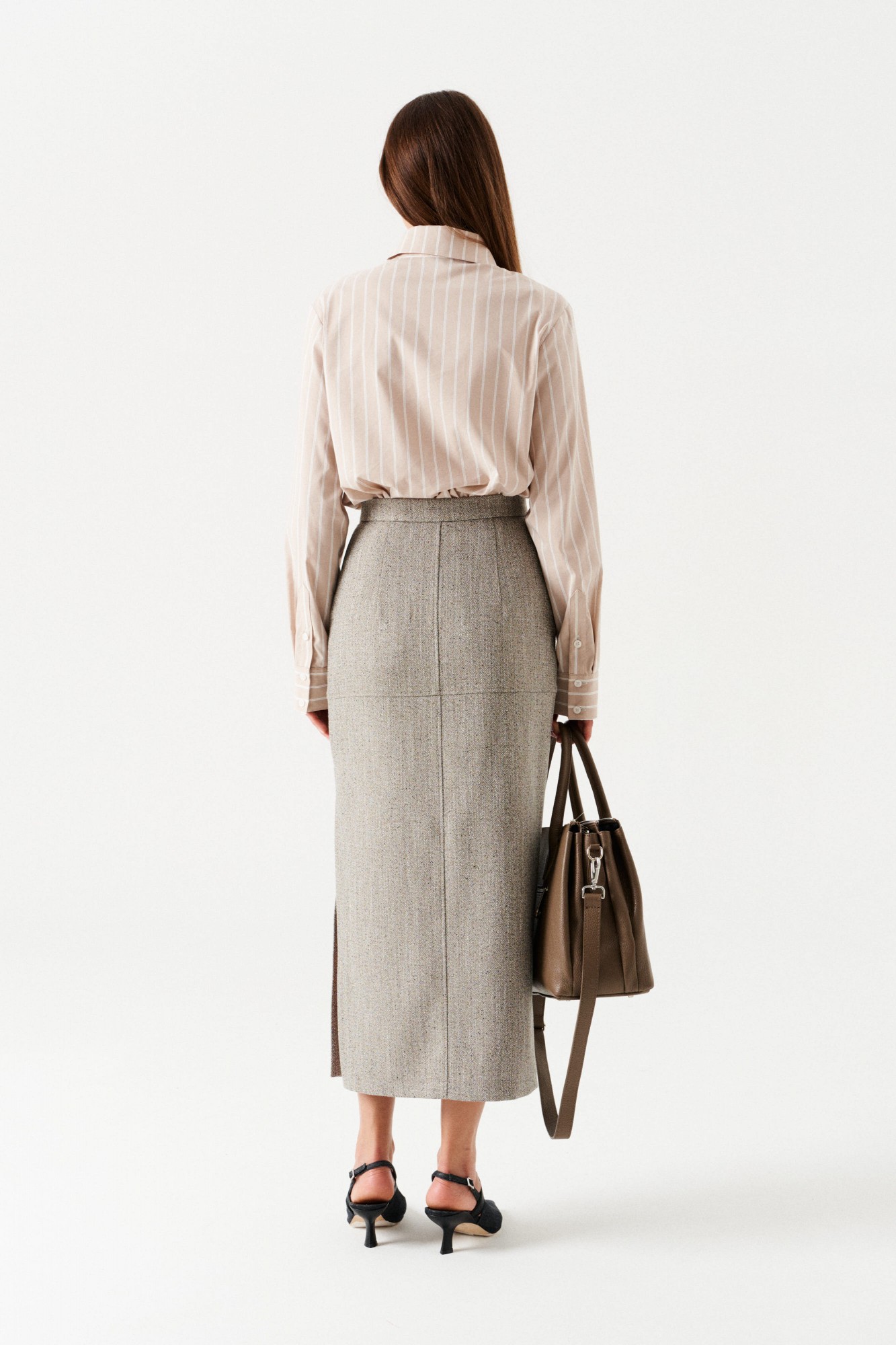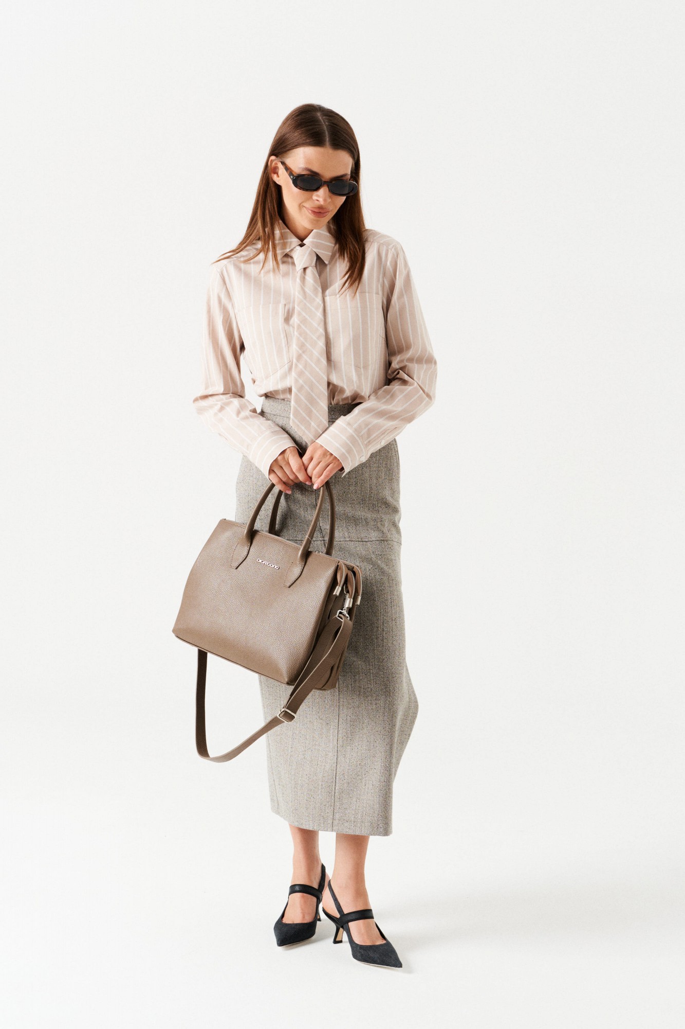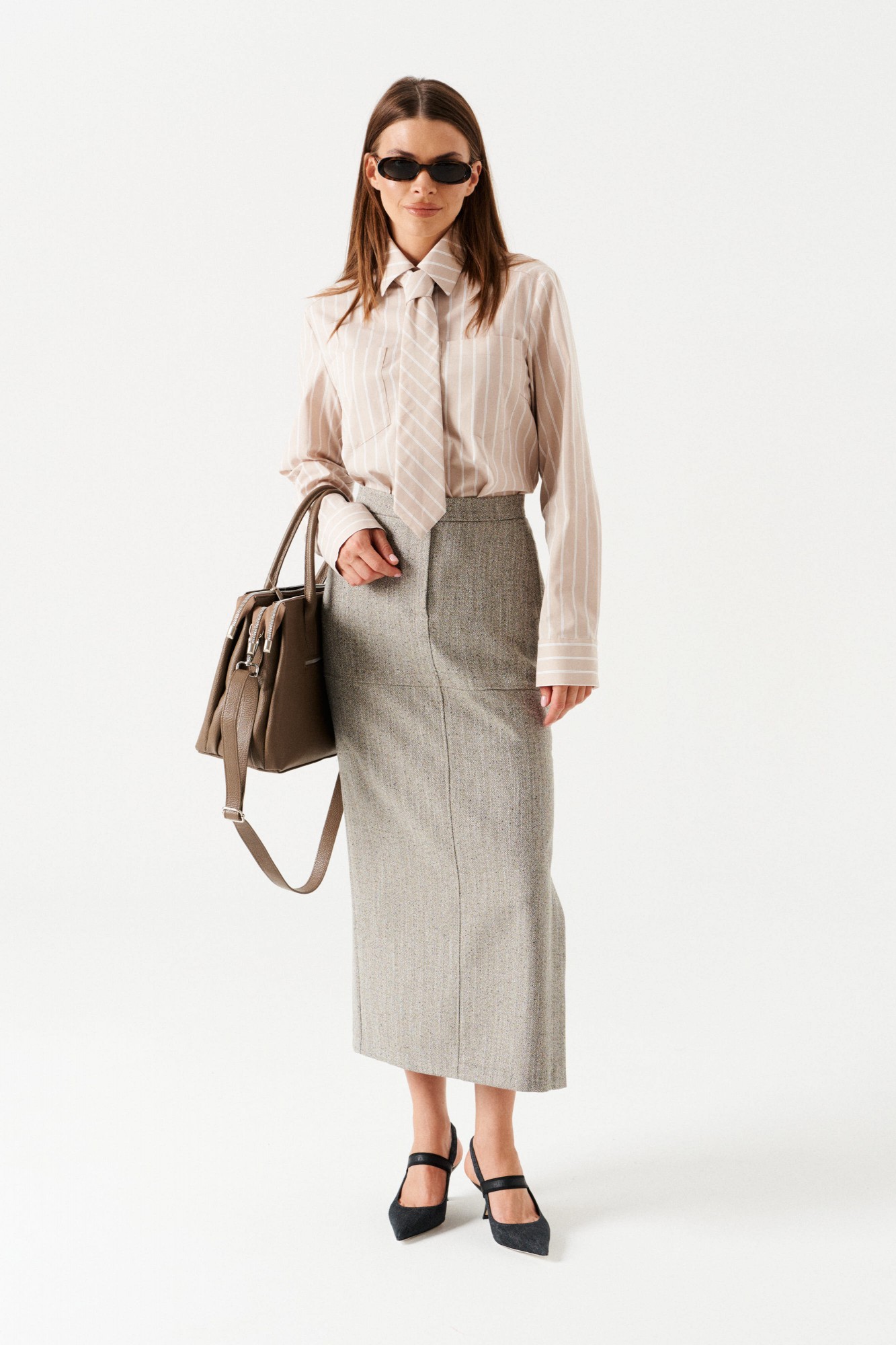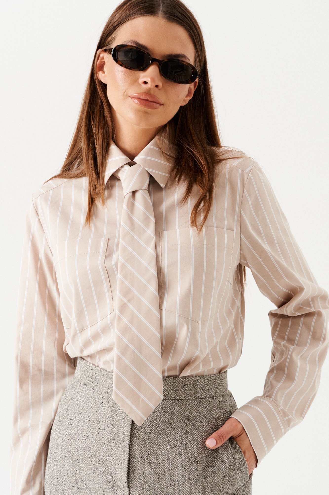 Блузка-рубашка прямая, свободная, с центральной застежкой на петли и пуговицы. Воротник рубашечный, отложной, на притачной стойке. По полочкам в верхней части – симметричные накладные карманы. Спинка цельная. Боковые швы заканчиваются разрезом. Рукав втачной, длинный, с отрезной манжетой, застежкой на петли и пуговицы. В комплекте съемный галстук.