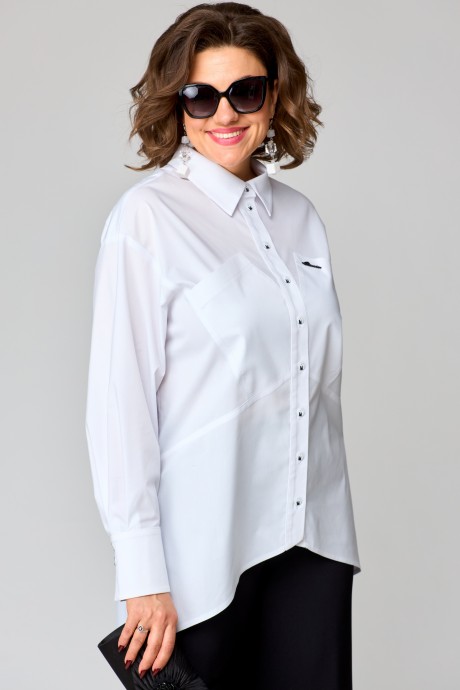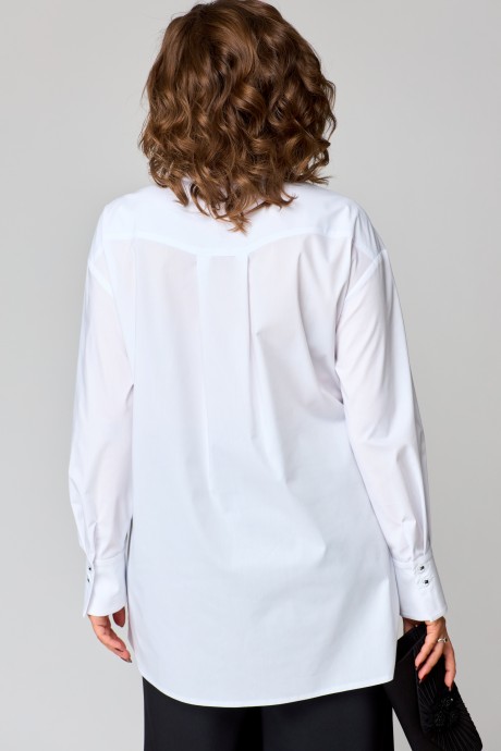 Блузк женская повседневная прямого силуэта с фигурным низом выполнена из хлопка. Вырез горловины воротник на стойке рубашечного типа, застежка доверх на обметанные петли и пговицы. Рукав спущенный, втаной на притачной манете, в боковых швах обработаны разрезы. На полочках два накладных кармана. по спинке фигурная кокетка и встречная складка. декором служат отделочные элементы, декоративные пуговицы и металличека лейба на кармане.