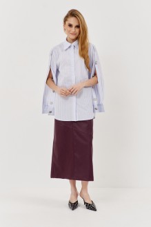 Рубашка свободного силуэта с декоративными рукавами. Характеристики: выполнена из рубашечной ткани в полоску, центральная застежка на петли и пуговицы, по спинке отрезная кокетка, по центру рукава обработана планка на петли и пуговицы, низ рукава обработан манжетой на петли и пуговицы.