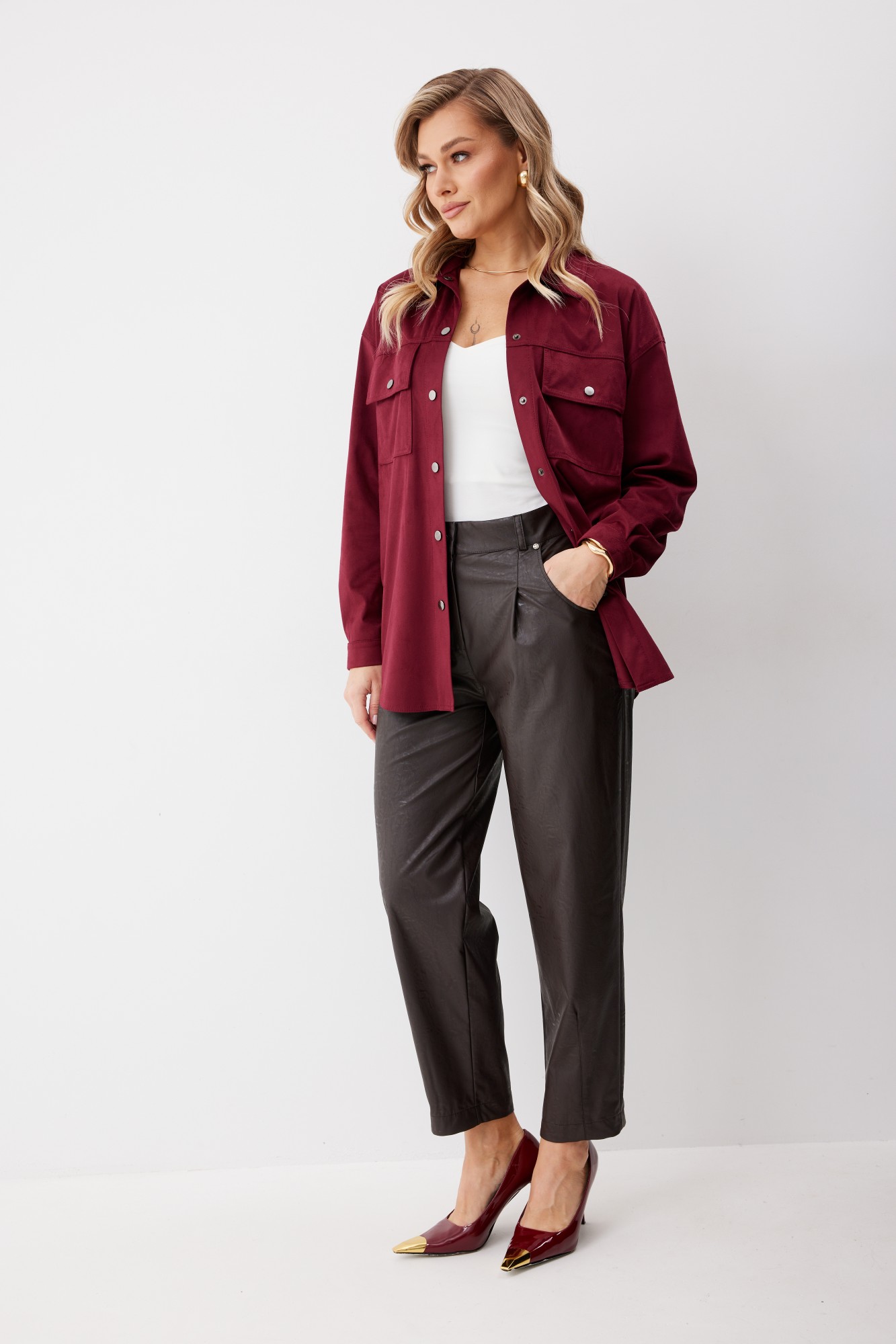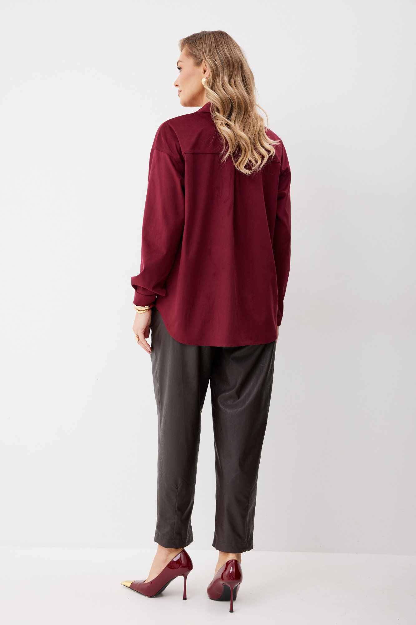 Рубашка женская прямого силуэта из замшевой ткани длиной за линию бедер. По переду отрезные кокетки и нагрудные накладные карманы с клапаном, застегивающиеся на кнопку. Спинка с отрезной кокеткой и встречной складкой. Линия плеча спущена. Рукав рубашечный втачной по низу с 2 –мя складками и отрезной манжетой, застегивающейся на кнопку. Воротник втачной рубашечный. Линия низа имеет фигурную форму. Воротник, кокетки, карманы, линия проймы отстрочены отделочными строчками. Застежка на кнопки центральная.