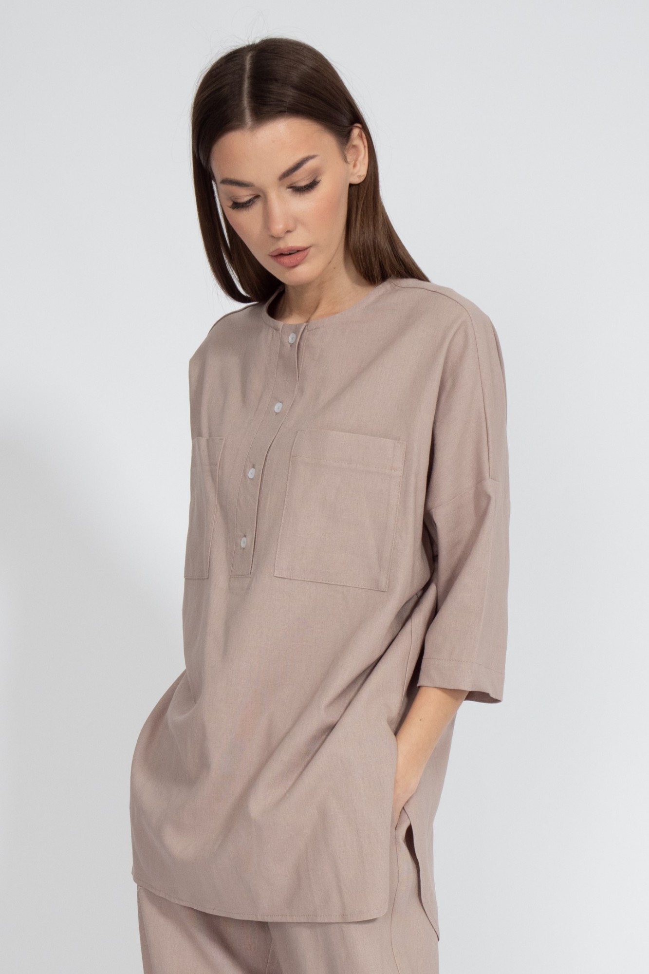 Рубашка лен свободного кроя со спущенными рукавами и накладными карманами, застежкой поло. Удлиненная по спинке, с разрезами в боковых швах. Прекрасно сочетается с шортами модели 4074, брюками модели 4076, джоггерами модели 4082. Ткань лен. Рост 170