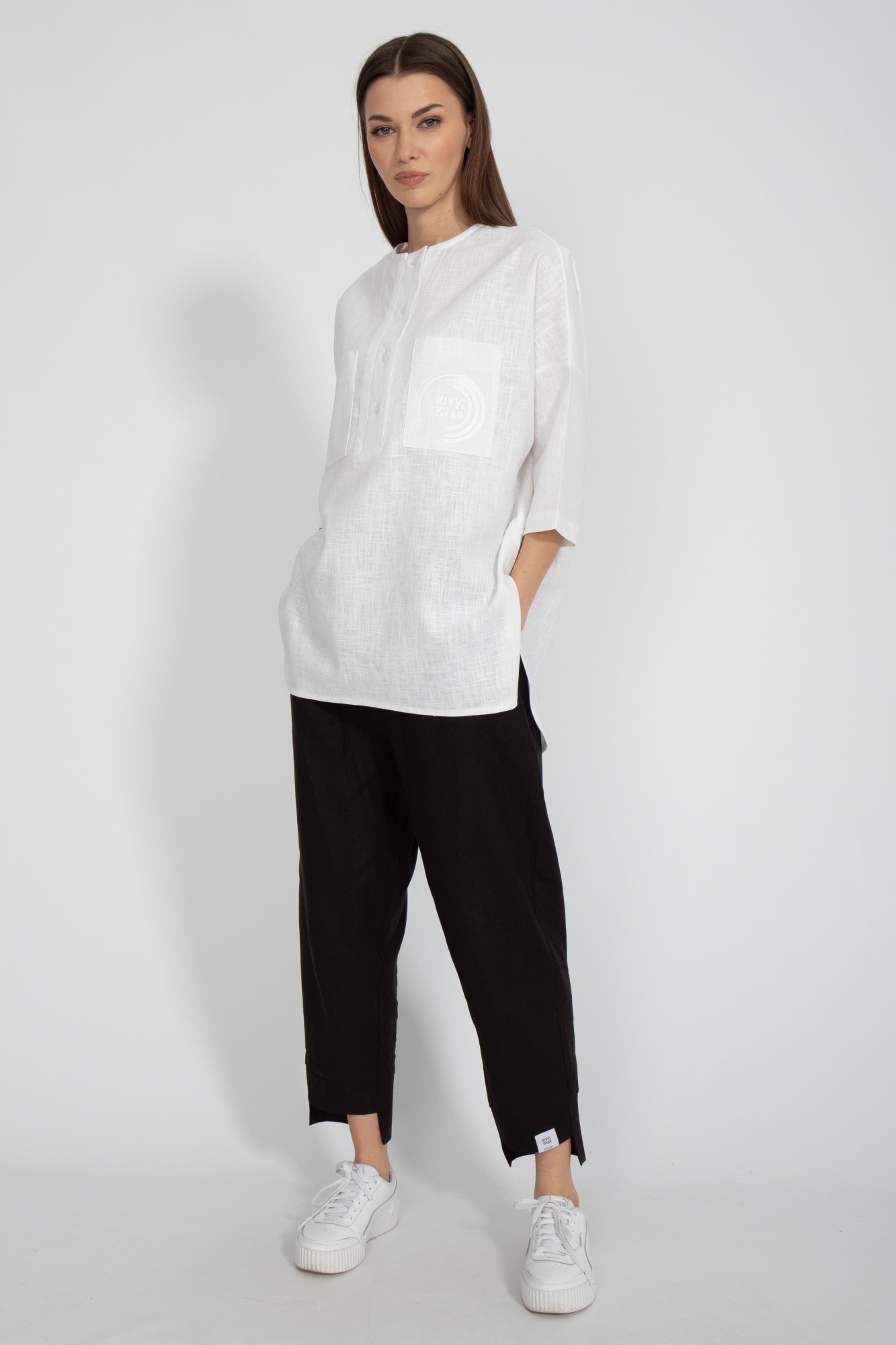 Рубашка лен свободного кроя со спущенными рукавами и накладными карманами, застежкой поло. Удлиненная по спинке, с разрезами в боковых швах. Прекрасно сочетается с шортами модели 4074, брюками модели 4076, джоггерами модели 4082. Ткань лен. Рост 170