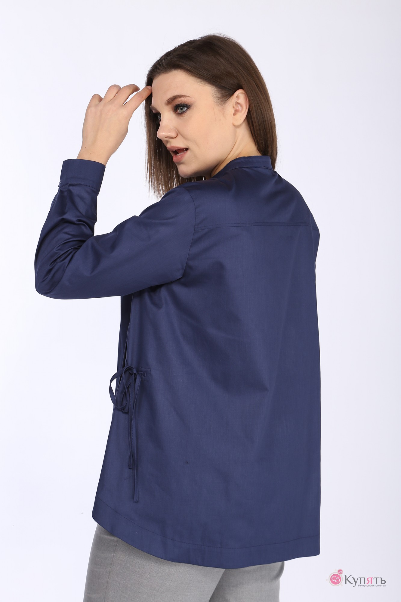 Рубашка женская с круглым вырезом горловины, обработанным воротником стойкой. Центральная потайная застежка на петли и пуговицы. Детали переда и спинки с закругленным низом. Перед с нагрудными вытачками, отделочными деталями с завязками. Спинка с горизонтальной кокеткой, переходящая на перед. Рукава рубашечные, длинные, одношовные. Низ рукавов с притачными манжетами, застегивающимися на петли и пуговицы. По швам притачивания манжет заложена складка. Разрезы рукавов обработаны "английской" планкой. Размеры 48-52: длина блузы 77 см, длина рукава 59 см.