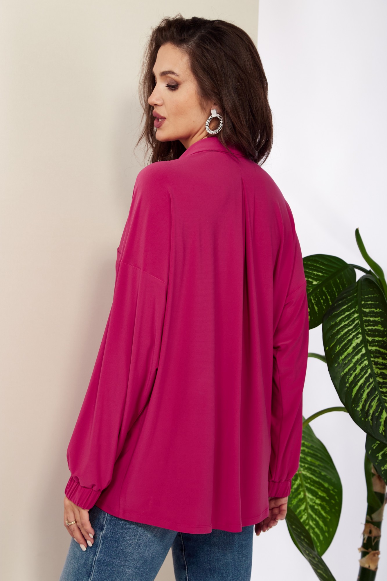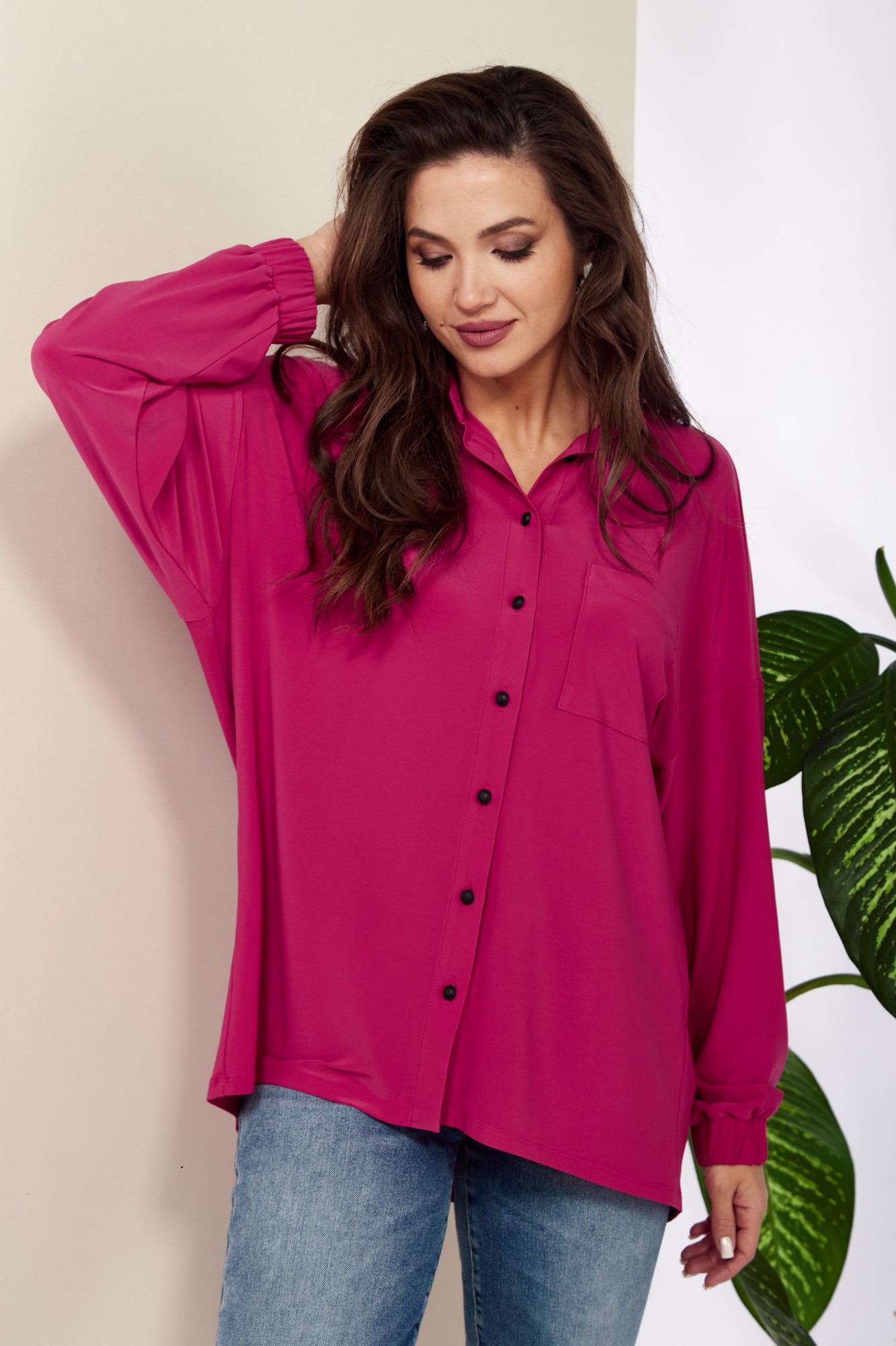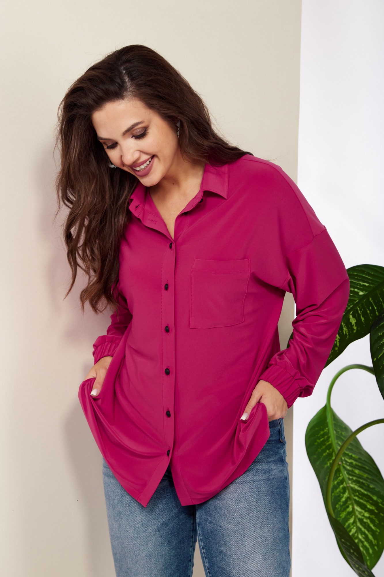 Блузка женская, прямого силуэта, из трикотажного полотна масло ,со спущенным плечом. Застежка модели на планку и пуговицы, воротник на стойке, по полочке идет накладной карман, манжет рукава на резинке.