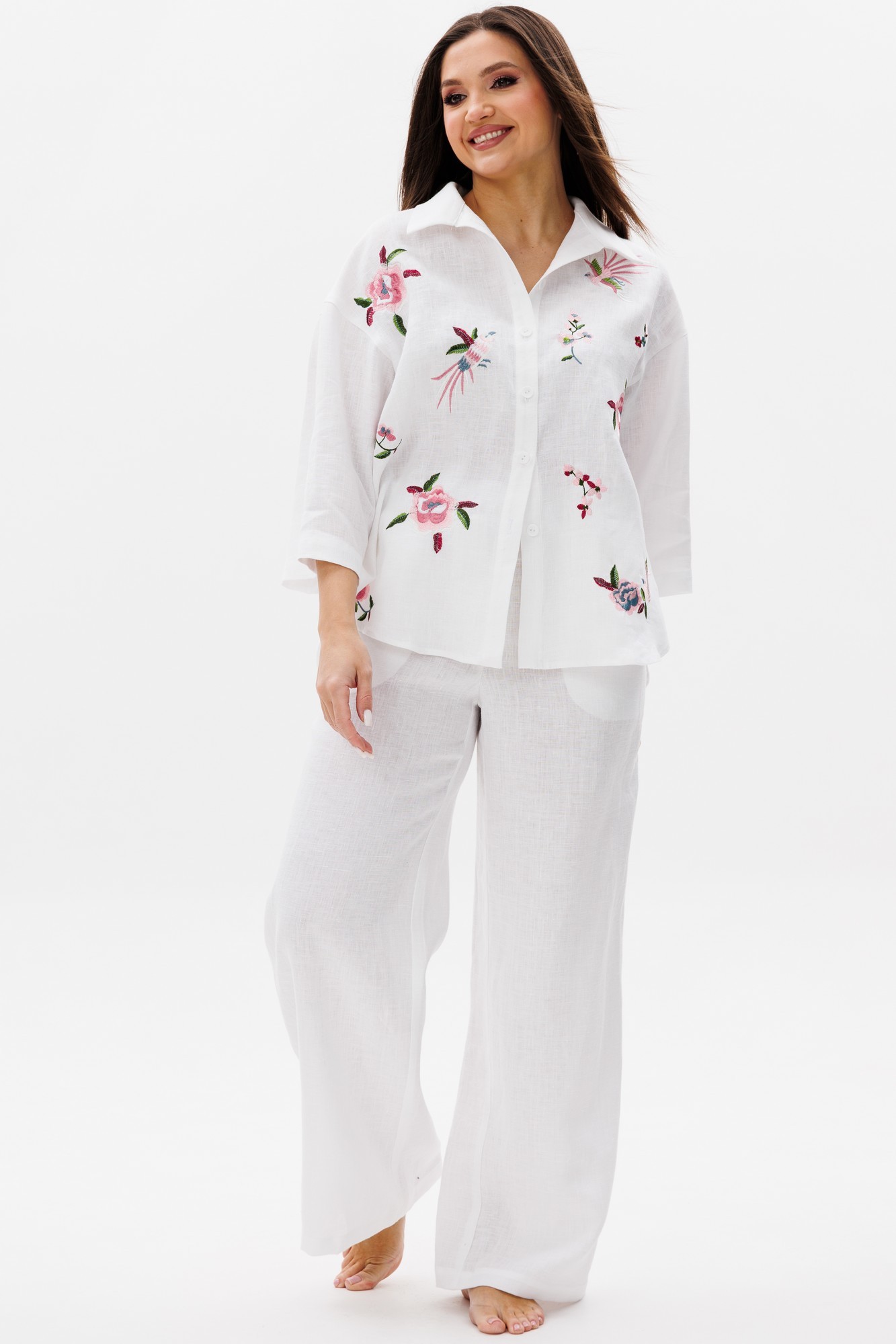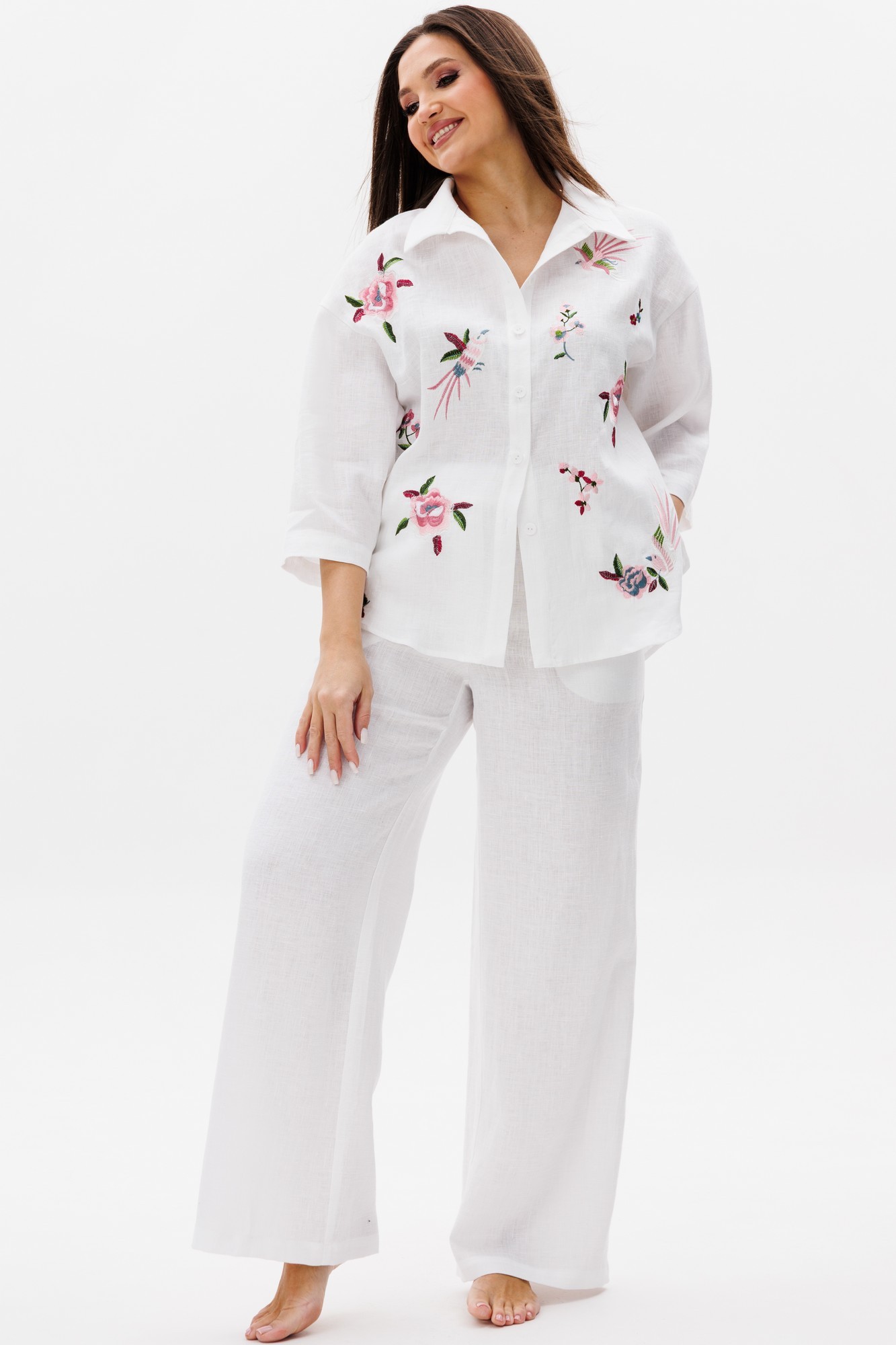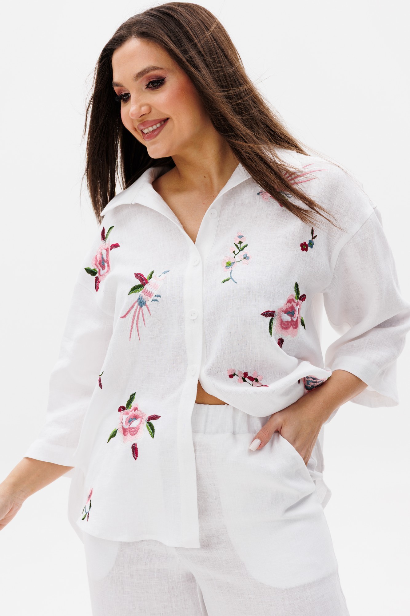 Воротник отложной рубашечного типа. Застежка центральная на петли и пуговицы, спинка с кокеткой. На полочке расположены дизайнерские вышивки. Рукав 3/4 со спущенной линией плеча, одношовный.
