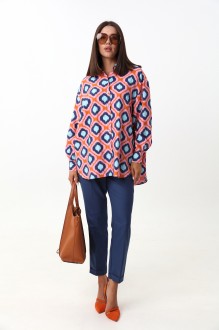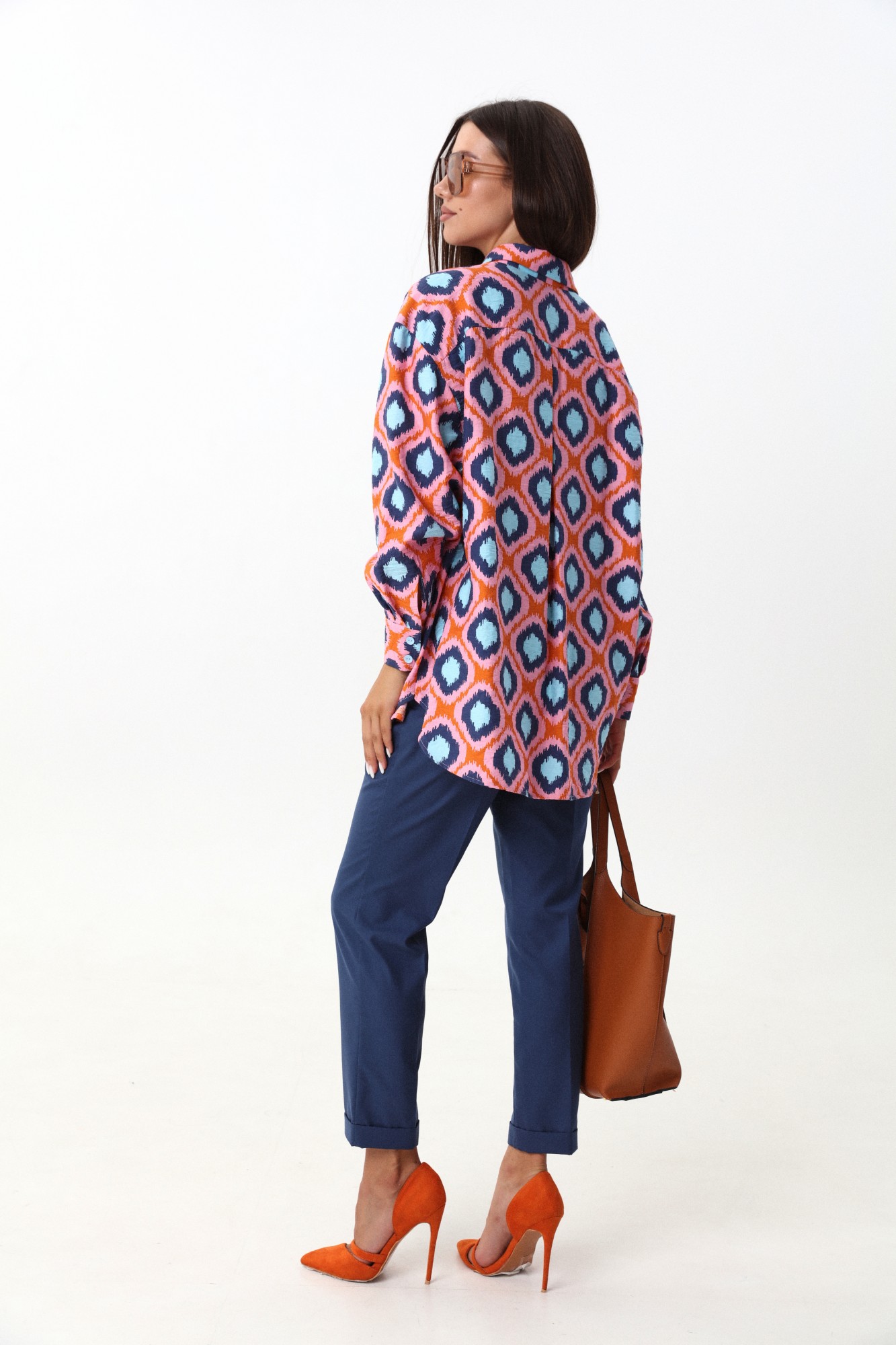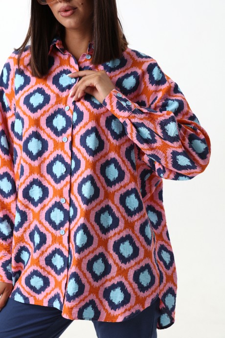 Рубашка женская большого объема, прямого силуэта. На детали спинки расположена двойная кокетка, переходящая на деталь полочки. Под кокеткой на спинке встречная складка. Воротник рубашечный отложной на стойке. Застежка планка центральная на прорезные петли и пуговицы. Линия плеча спущенная, рукав рубашечный, длинный. В нижней части рукава заложены складки, заканчивается манжетой с двумя прорезными петлями и пуговицами. Низ блузки разноуровневый: спереди короче, сзади длиннее.