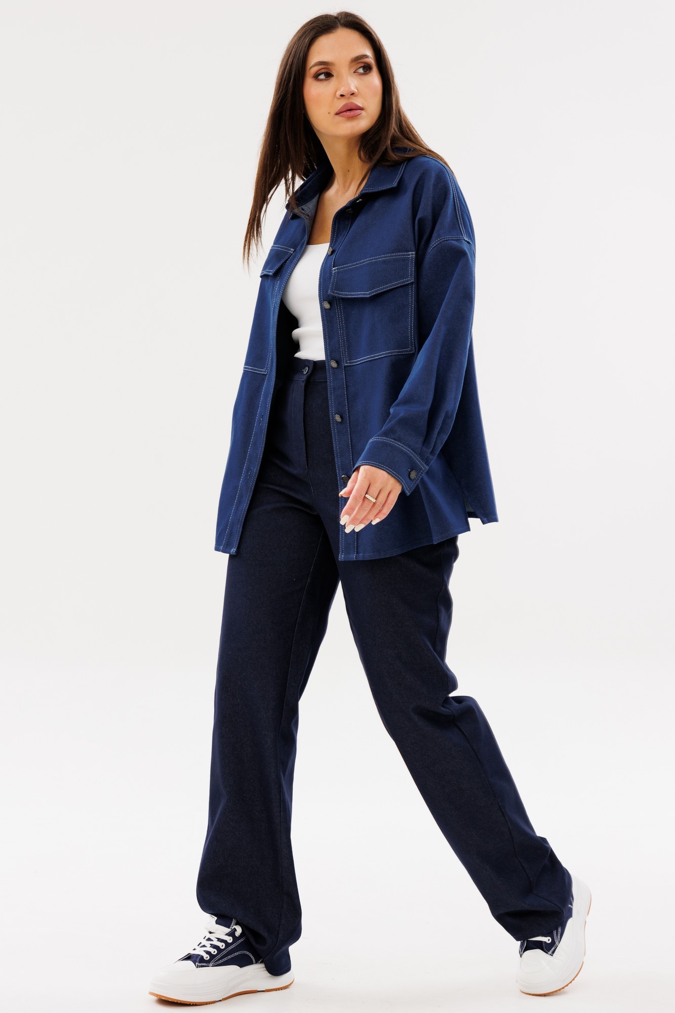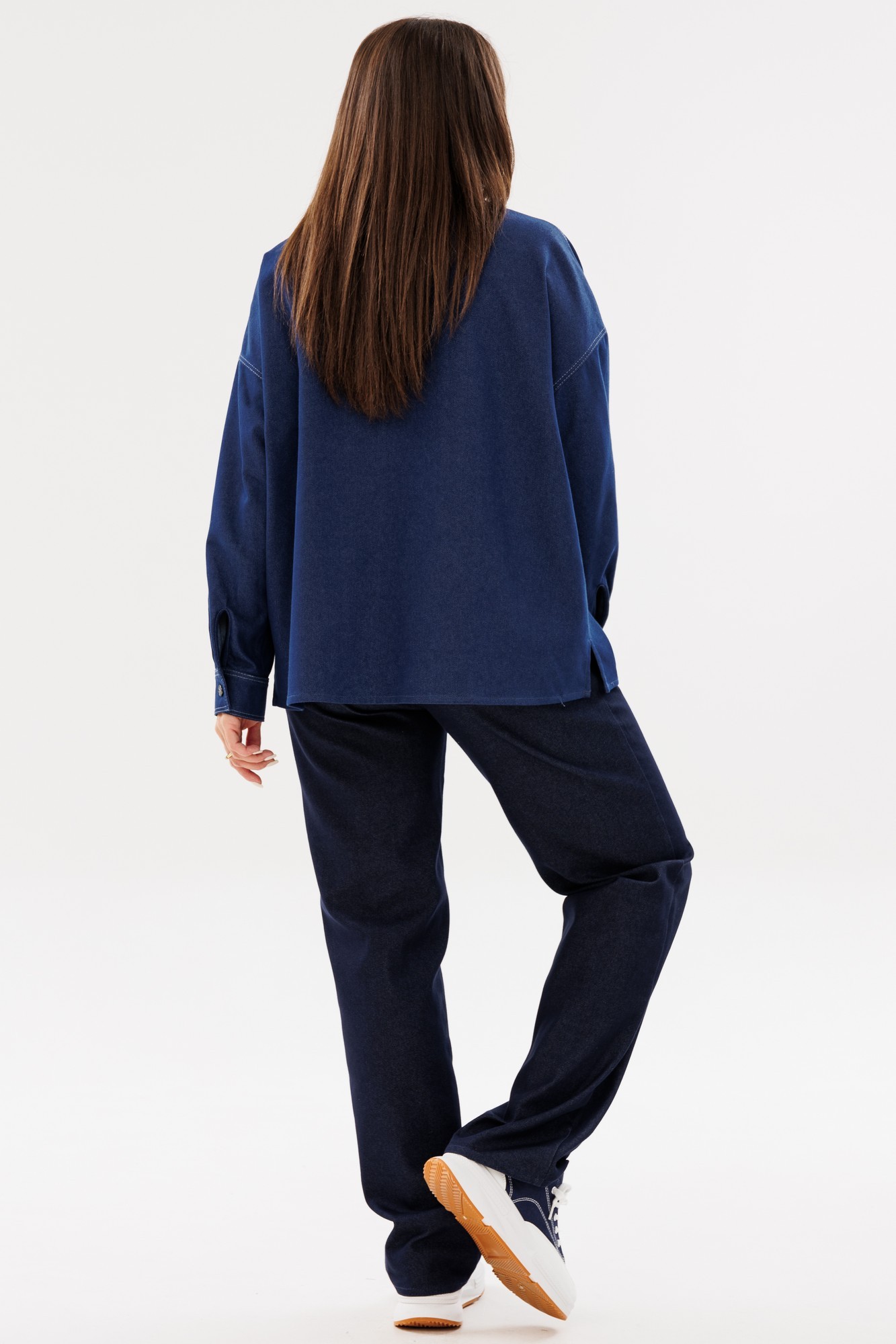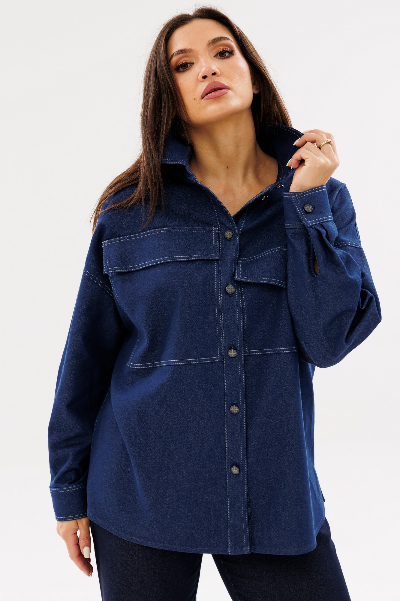 Рубашка Ma Сhérie из джинсовой ткани свободного силуэта. Воротник отложной на стойке. Перед с разного размера накладными карманами с клапанами. Застежка центральная на петли и пуговицы. Спинка цельная, в боковых швах разрезы. Рукав одношовный втачной с притачной манжетой по низу, линия плеча спущена. Рубашка фрагментарно декорирована отделочной строчкой контрастного цвета. Обращаем ваше внимание, что возможна замена фурнитуры на аналогичную такого же качества. Комфортная рубашка для повседневного образа будет идеально смотреться с нашими джинсовыми брюками 2065 или 2066, а также брюками из экокожи 2071 и 2073.