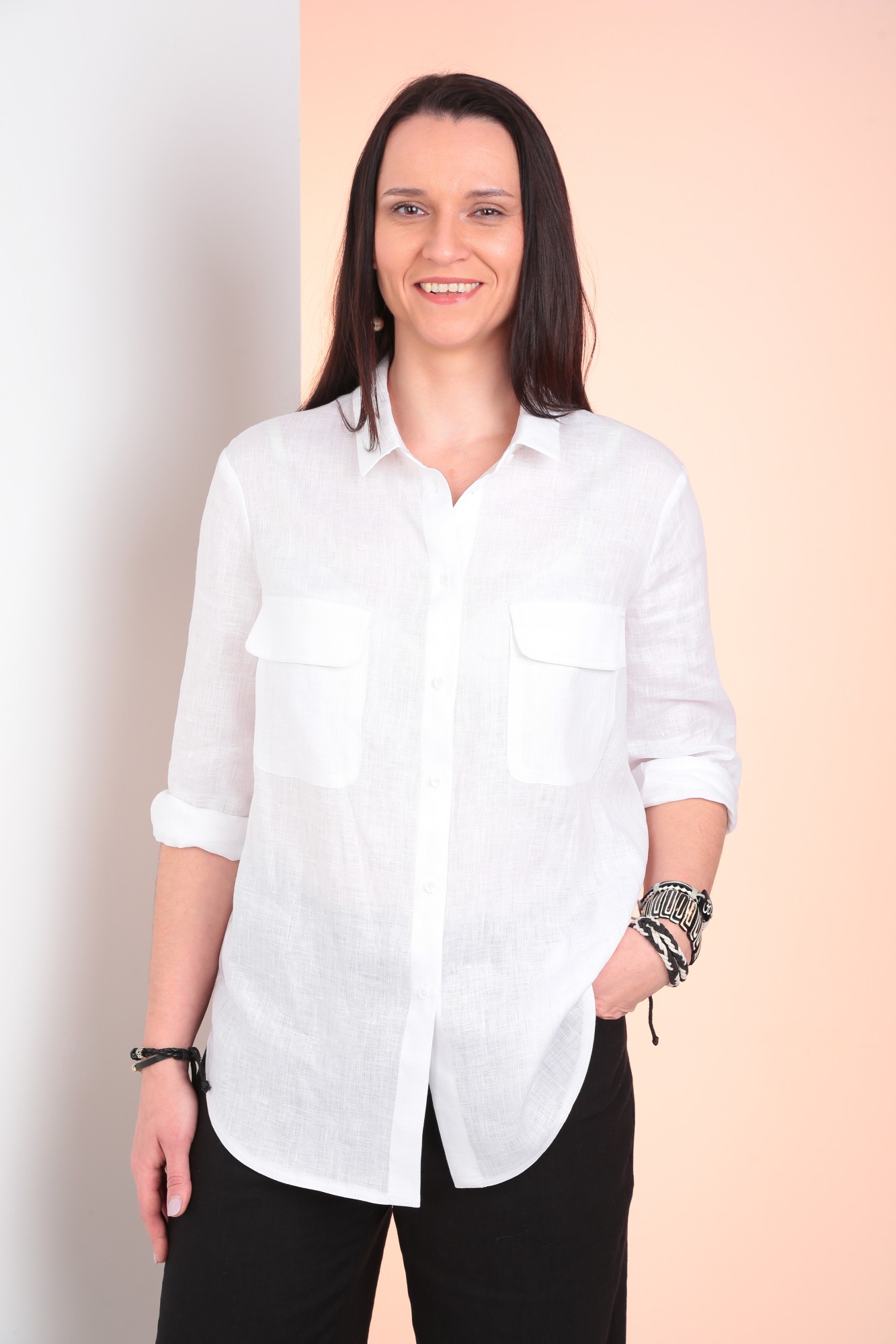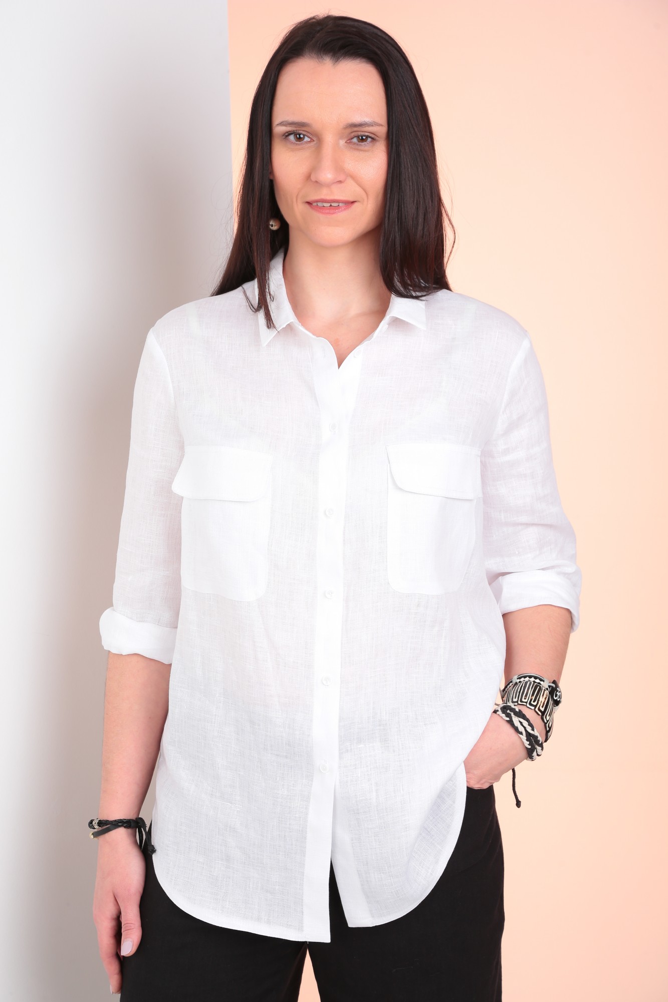 Рубашка прямого силуэта, с втачным рукавов длиной 3/4. На полочке в верхней части накладные карманы с клапаном. Центральная бортовая застежка на петли-пуговицы. Воротник рубашечный втачной на стойке.