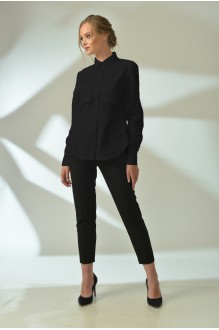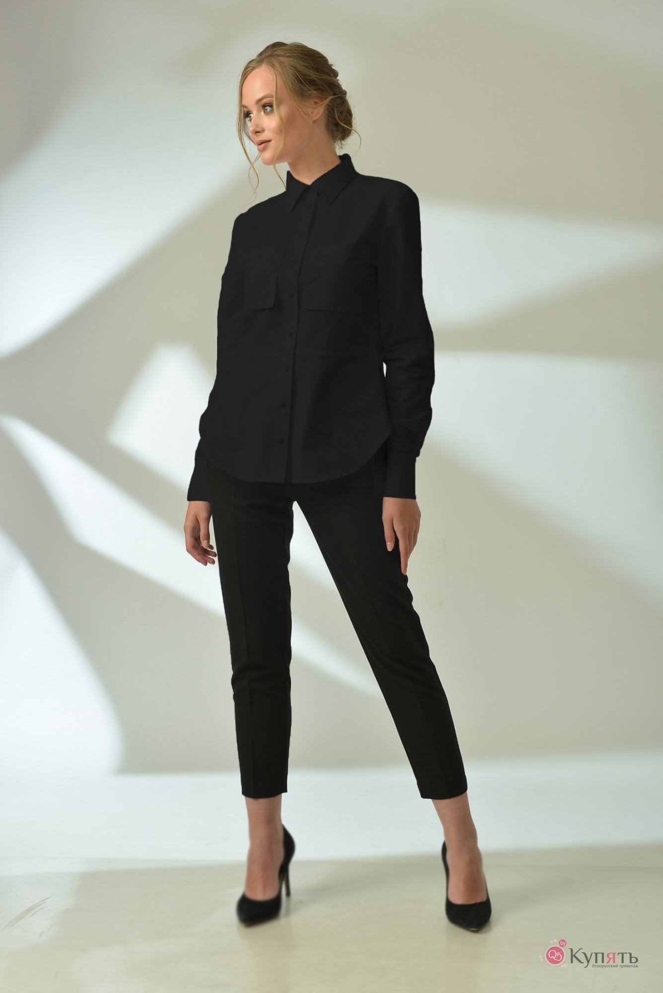 Блузка прямого силуэта с центральной застёжкой на петли и пуговицы. Перед с подрезом, фигурной нижней частью и настрочными карманами. Спинка с кокеткой и подрезом в нижней части. Рукав одношовный с притачной манжетой.