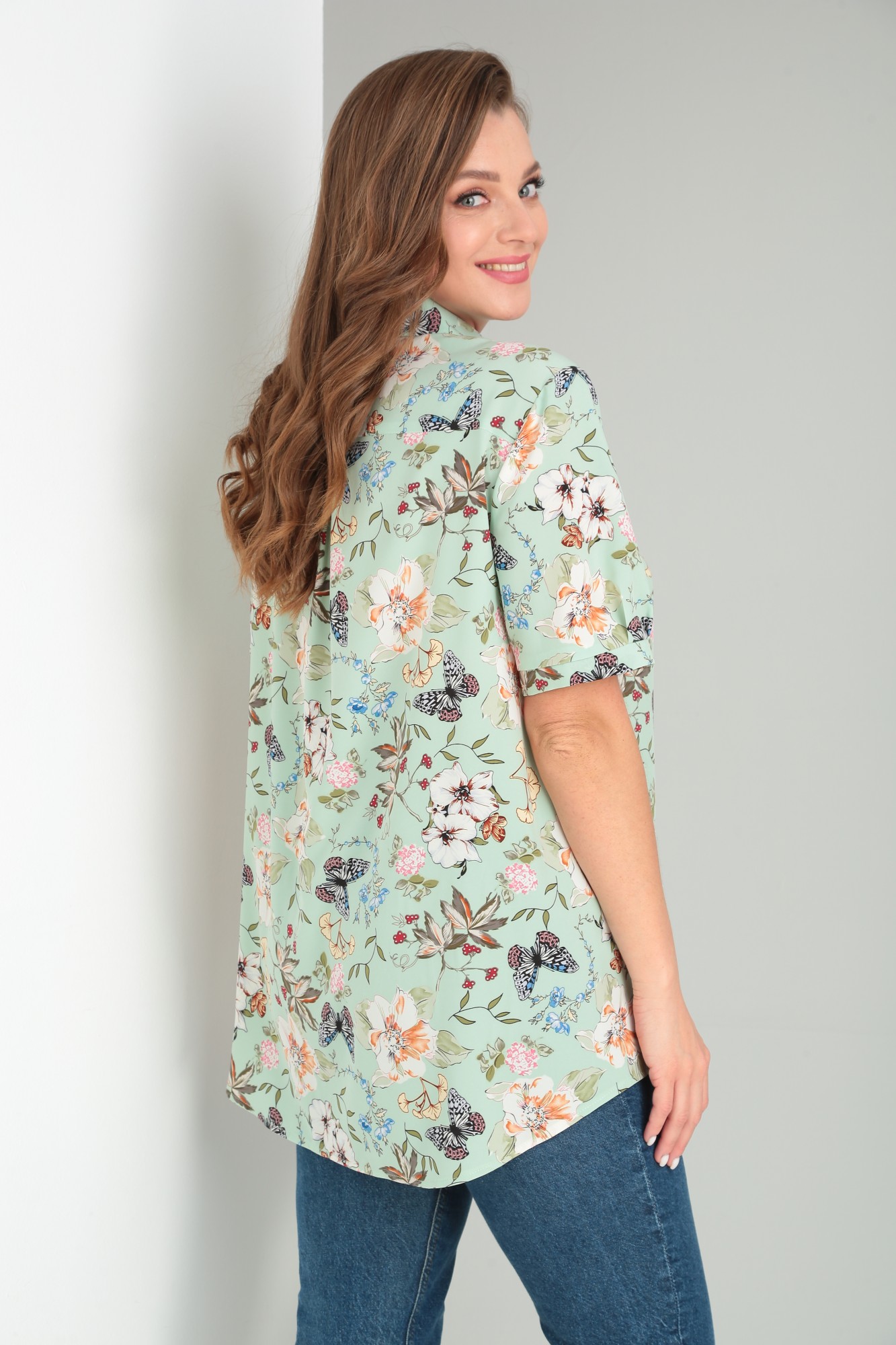Женская блузка свободного силуэта с рубашечным воротником. Передние полочки изделия отрезные с нагрудными и рельефными вытачками. По переду блузки потайная планка на застежку на пуговицы. Рукав прямой, втачной, длинной до локтя с патой на пуговицу. Спинка с кокеткой и сборкой. Низ изделия рельефный, спинка длиннее.