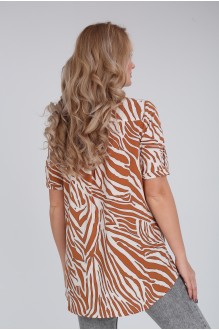 Стильная женская блуза с цельнокроеной кокеткой спинки и полочки. Воротник рубашечный со стойкой. По переду потайная застежка на пуговицы. Рукав прямой, втачной, короткий с манжетой. По спинке зашита встречная складка. Боковые швы, переходящие на переднюю полочку, на них настрочены и закреплены фигурные планки, которые образуют по низу V-образные разрезы. Низ блузы фигурный.