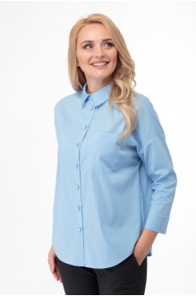 Стильная рубашка свободного кроя с центральной планкой на застежку (8 пуговиц) по полочке, с накладным карманом на левой полочке. Спинка изделия цельная, по центру от горловины застрочена встречная складка. Плечо изделия спущено. Рукав 7/8 прямой с широкой манжетой. Воротник со стойкой. Низ изделия фигурный отстрочен отделочной строчкой.