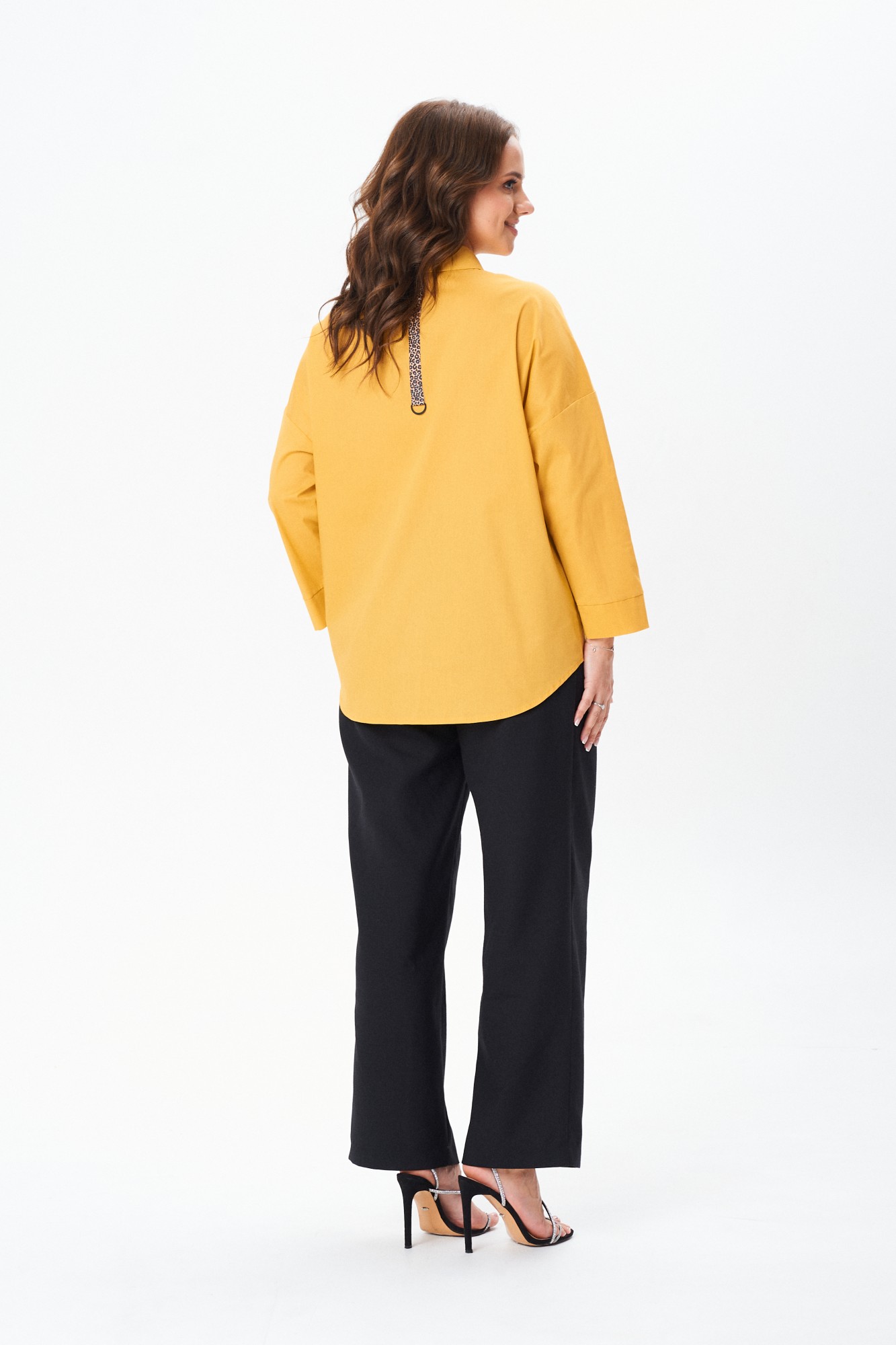 Стильная рубашка свободного кроя с центральной планкой на застежку петли-пуговицы и накладными карманами по переду. Плечо изделия спущено. Рукав 7/8 прямой с широкой манжетой. Воротник со стойкой. Спинка изделия цельная. Низ изделия фигурный отстрочен отделочной строчкой.