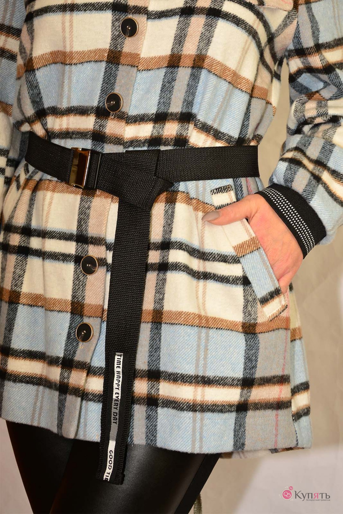 Блузка женская из смешанной ткани, в состав которой входит хлопок, с рисунком "клетка". Блузка длиной ниже линии бедер, силуэт от свободного до приталенного (зависит от регулирования съемным поясом), повседневная, с втачным рукавом, с центральной застежкой на 7 обметанных петель и 7 пуговиц. Перед с плечевыми патами, концы которой фиксируются на одну обметанную петлю и одну пуговицу, с цельнокроенной планкой под застежку, выше уровня груди с настрочными клапанами на котором обработана застежка на одну обметанную петлю и одну пуговицу, внизу с прорезным карманом с листочкой. Спинка цельная, с настрочной декоративной нашивкой, с разрезом по низу. Рукава втачные одношовные длинные, с притачной манжетой по низу из трикотажного довяза. Воротник стояче-отложной. Пояс на карабине входит в комплект.