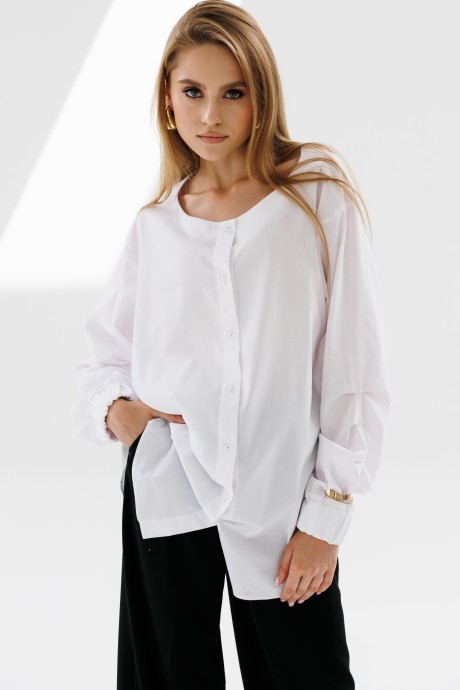 Рубашка прямого кроя с центральной застёжкой на петли и пуговицы. Вырез горловины глубокий округлый. Линия плеча приспущена. На рукавах изделия заложены декоративные защипы, по низу - широкая резинка. Рукава - фонарики.