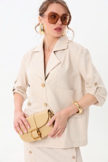 Рубашка прямого силуэта с притачной планкой с застёжкой на петли и пуговицы. Рукав втачной одношовный со спущенной линией плеча с патой. Воротник рубашечный стояче-отложной. Перед состоит из трёх частей : центральная часть ,верхняя часть и нижняя часть. Спинка состоит из двух частей . Линия низа фигурная с широкой окантовкой. Жилет съёмный прямого силуэта без застёжки, воротник пиджачного типа. Линия низа фигурная, в комплект идёт пояс из основной ткани.