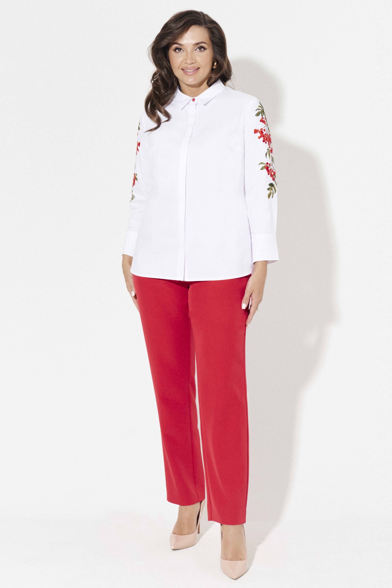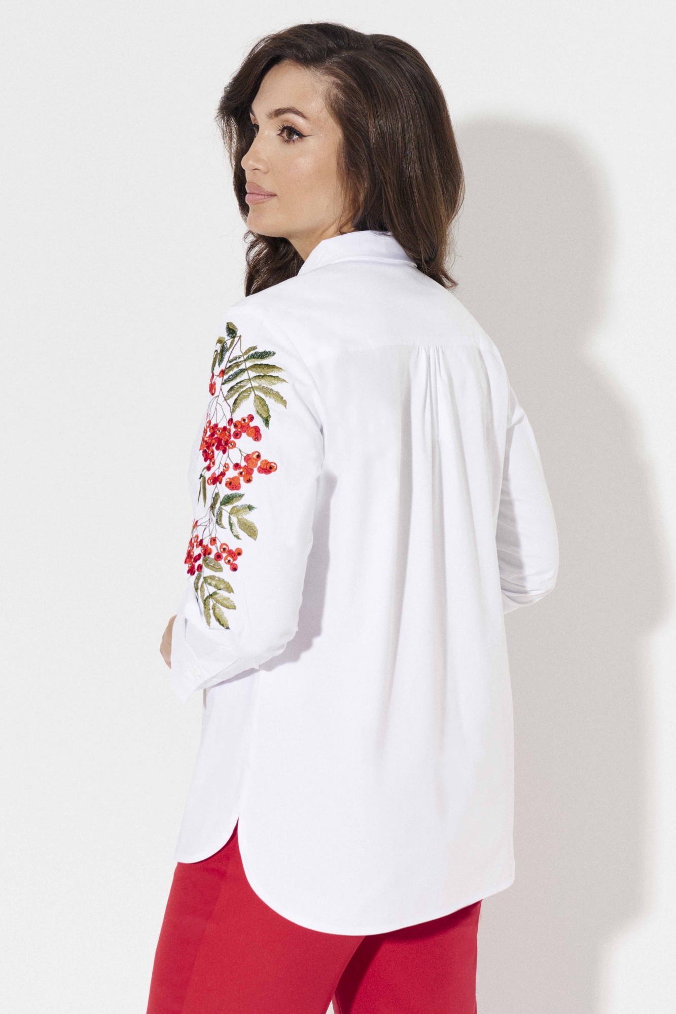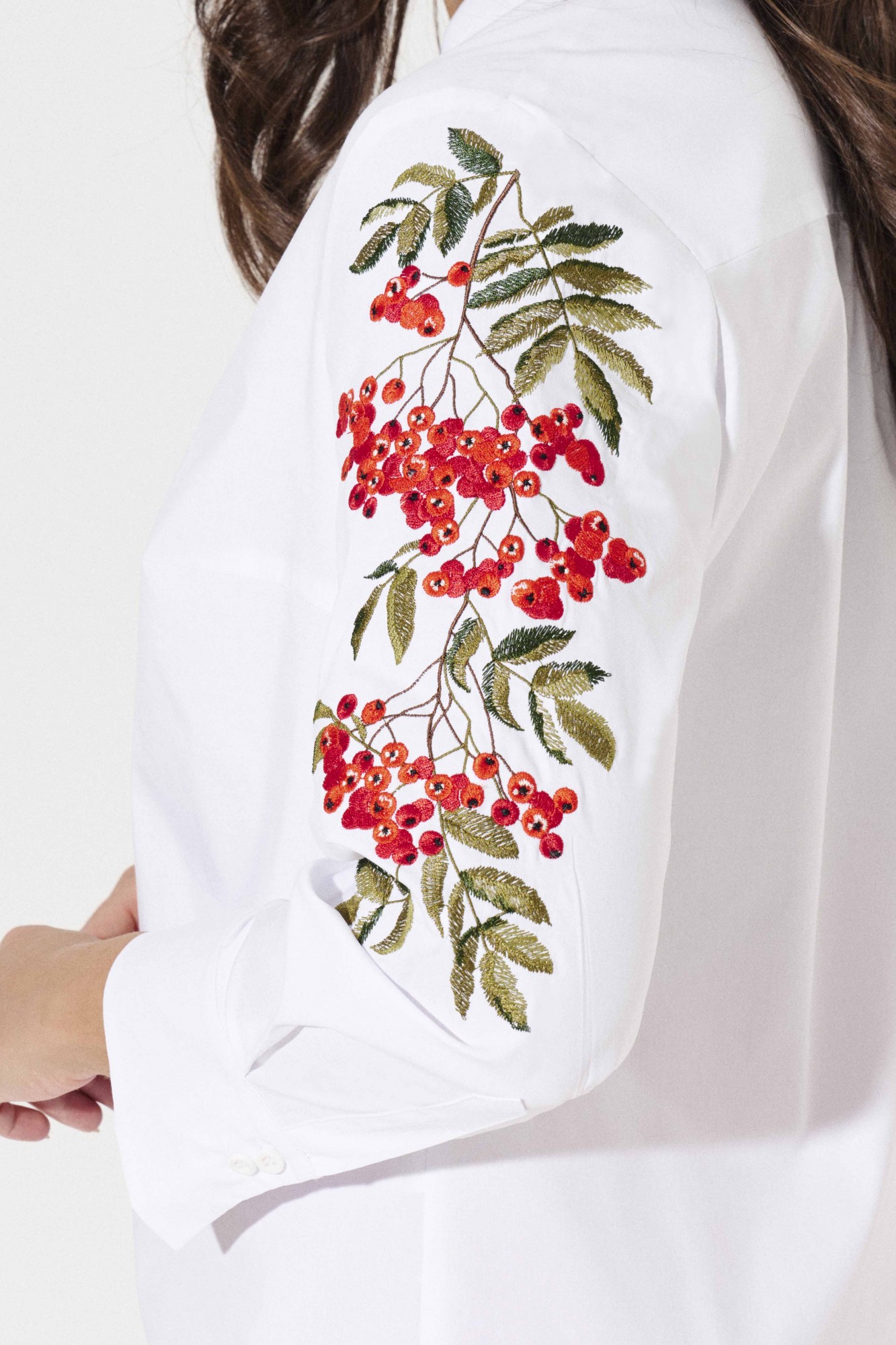 Блузка с вышивкой придаст вашему образу женственность и нежность. Даже в каждодневной суете в ней вы будете ощущать себя элегантной и романтичной натурой. Нарядная блузка подойдет даже под деловой образ со строгими классическими брюками или прямой юбкой. Наденьте ее с любимыми джинсами - и получите эффектный повседневный аутфит. Блузка полуприлегающего кроя визуально стройнит фигуру. Данная блузка украшена гроздьями рябины, вышитыми на длинных рукавах с манжетами. Декор не кажется навязчивым, а придает модели утонченность. Низ изделия - асимметричный, скругленный, с разрезами в боковых швах. Застежка скрыта в потайной центральной планке. Рубашечный воротник украшает пуговица красного цвета. Блузка с вышивкой женская изготовлена из хлопковой ткани с мягкой, гладкой поверхностью. Материал не сминается, не парит, за ним легко ухаживать - стирать и гладить. Вы можете купить рубашку с вышивкой женскую для своего базового осенне-весеннего гардероба.