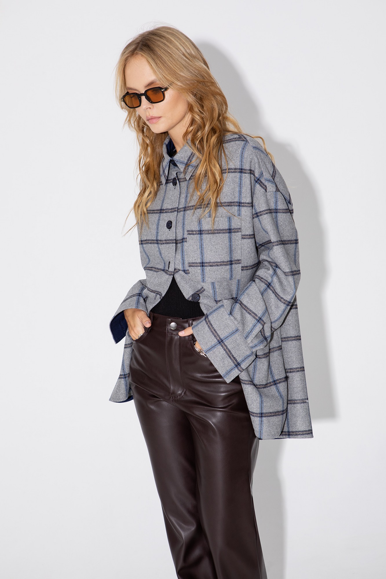 Оверсайз рубашка из утепленной ткани в клетку. Детали: рубашка прямого силуэта, спущенная линия плеча, застежка на петли и пуговицы, длинные рукава с притачными манжетами, фигурный низ.