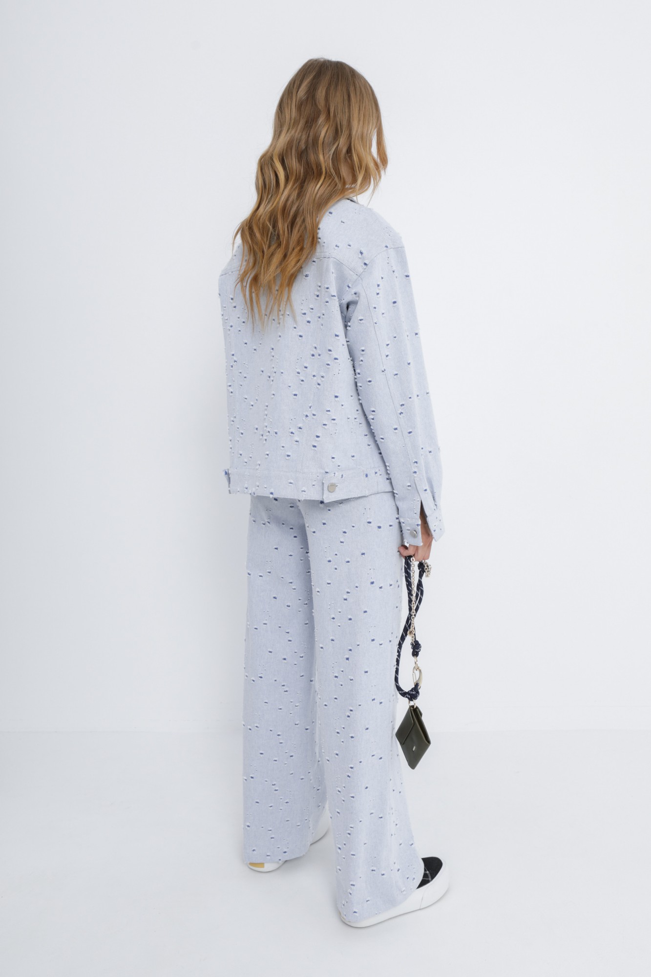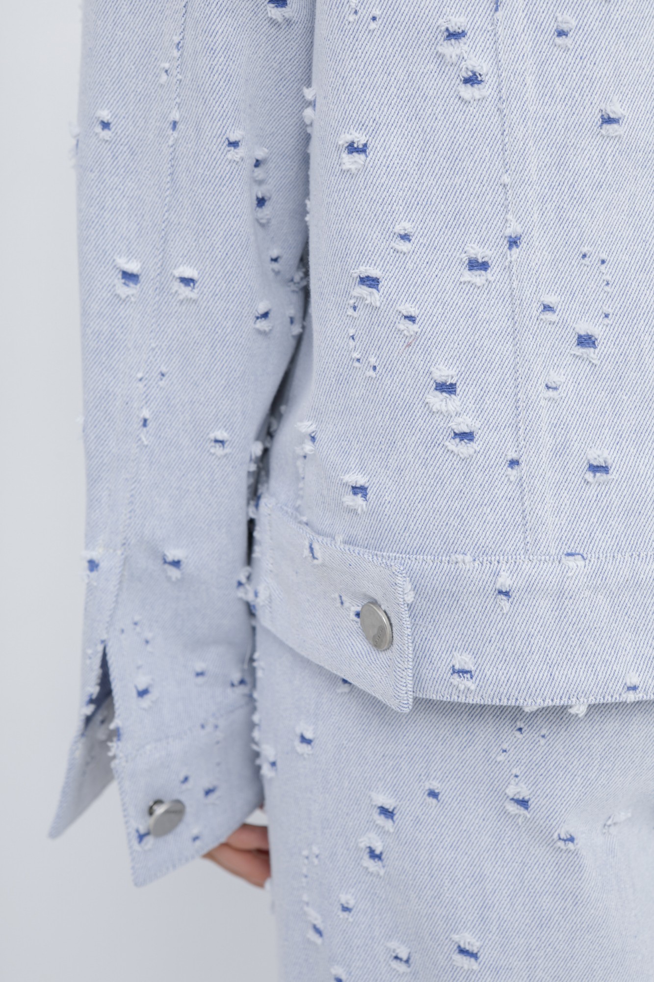 Свободная куртка-рубашка из хлопкового джинса с перфорацией. Детали: прямой силуэт, спущенная линия плеча, кокетки переда и спинки, рельефные швы, функциональные карманы, застежка на петли и металлические пуговицы, рукава длинные с притачными манжетами.