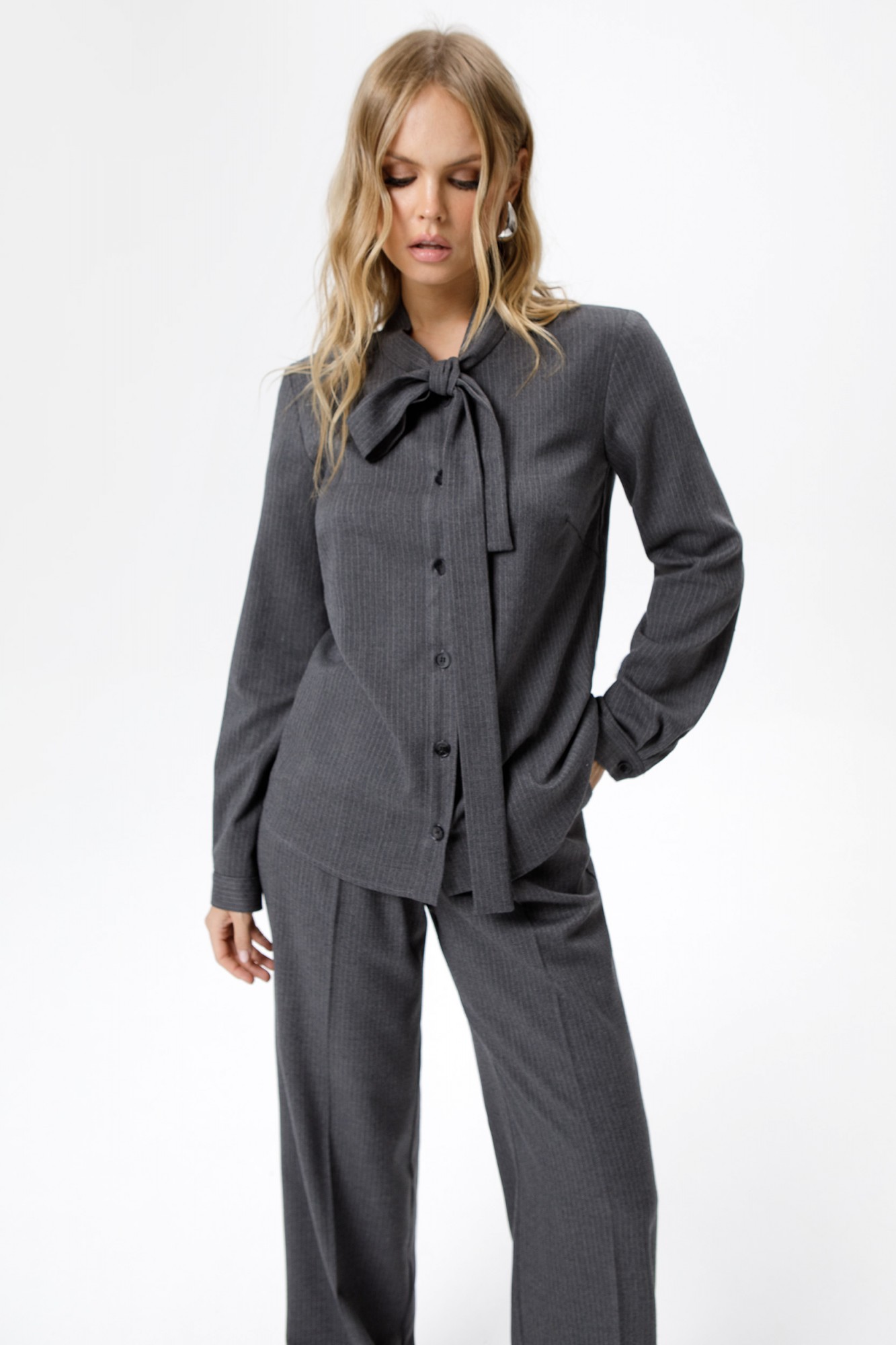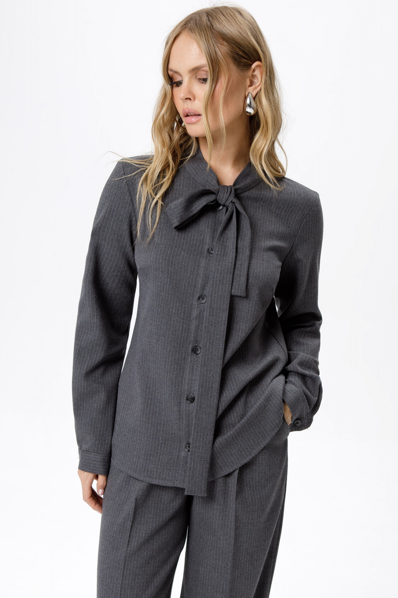 Рубашка с воротником-бантом. Детали: рубашка прямого силуэта, застежка на петли и пуговицы, длинные рукава с притачными манжетами.