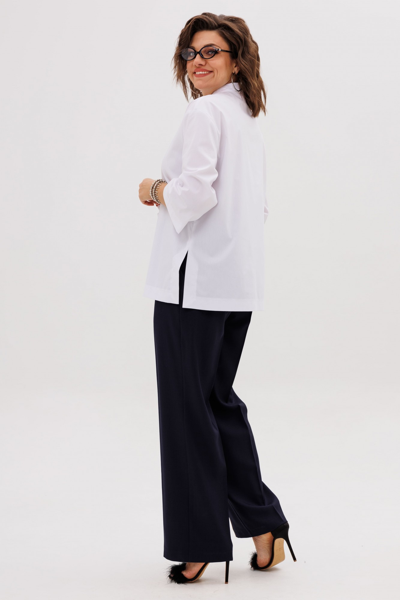 Белоснежная ткань, чистая и благородная, становится идеальным холстом для игры света и тени. Свободный, струящийся крой, вдохновленный традиционными восточными одеяниями, дарит неповторимое ощущение легкости и комфорта. Прямой силуэт, ниспадающий мягкими складками, обладает умиротворяющей гармонией и скрывает все лишнее, создавая идеальный контур.