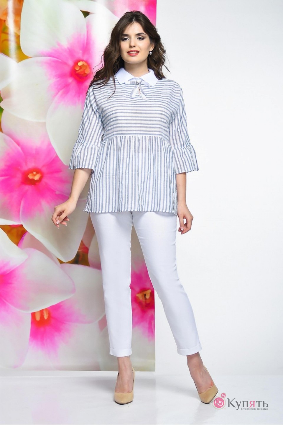 Блузка женская, полуприлегающего силуэта с цельнокроеным рукавом. Перед отрезной, чуть выше линии талии с приталенной оборкой со сборкой. Горловина округлой формы с разрезом по центру, обработана обтачкой. Спинка отрезная, чуть выше линии талии с цельнокроеным рукавом, с притачной оборкой со сборкой по низу спинки. Горловина обработана обтачкой. Рукав цельнокроеный 3/4 с притачной оборкой со сборкой. Имеется съемный воротник застегивающийся на петли пуговицы спереди. Отделочным украшением служит,декоративная съемная брошь.