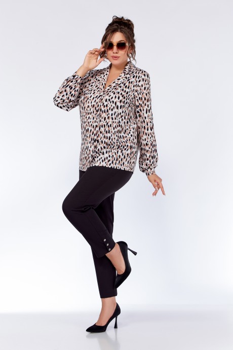 Блузка женская, прямого силуэта. По переду блузы обработаны нагрудные вытачки. Воротник – пиджачного типа. Застёжка центральная на петли и декоративные пуговицы. Спинка цельнокроеная. Рукав втачной одношёвный, со сборкой. По низу рукава - притачная манжета, застёгивающаяся на петлю и декоративную пуговицу. Ремень не входит в комплект. Блуза прекрасно сочетается с брюками Модель 305,342.