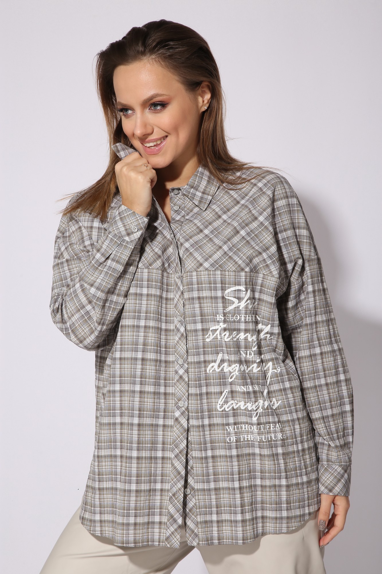 Рубашка женская, прямого силуэта, объемная. По переду и спинке отрезные кокетки. Рукав длинный со спущенной линией плеча. По низу притачная манжета с застежкой на петлю и пуговицу. Воротник рубашечный на отрезной стойке. Застежка центральная, оформлена отрезной планкой на петли и пуговицы. По переду, от кокетки, ассиметричный декор-принт со стразами. них рубашки фигурной формы.
