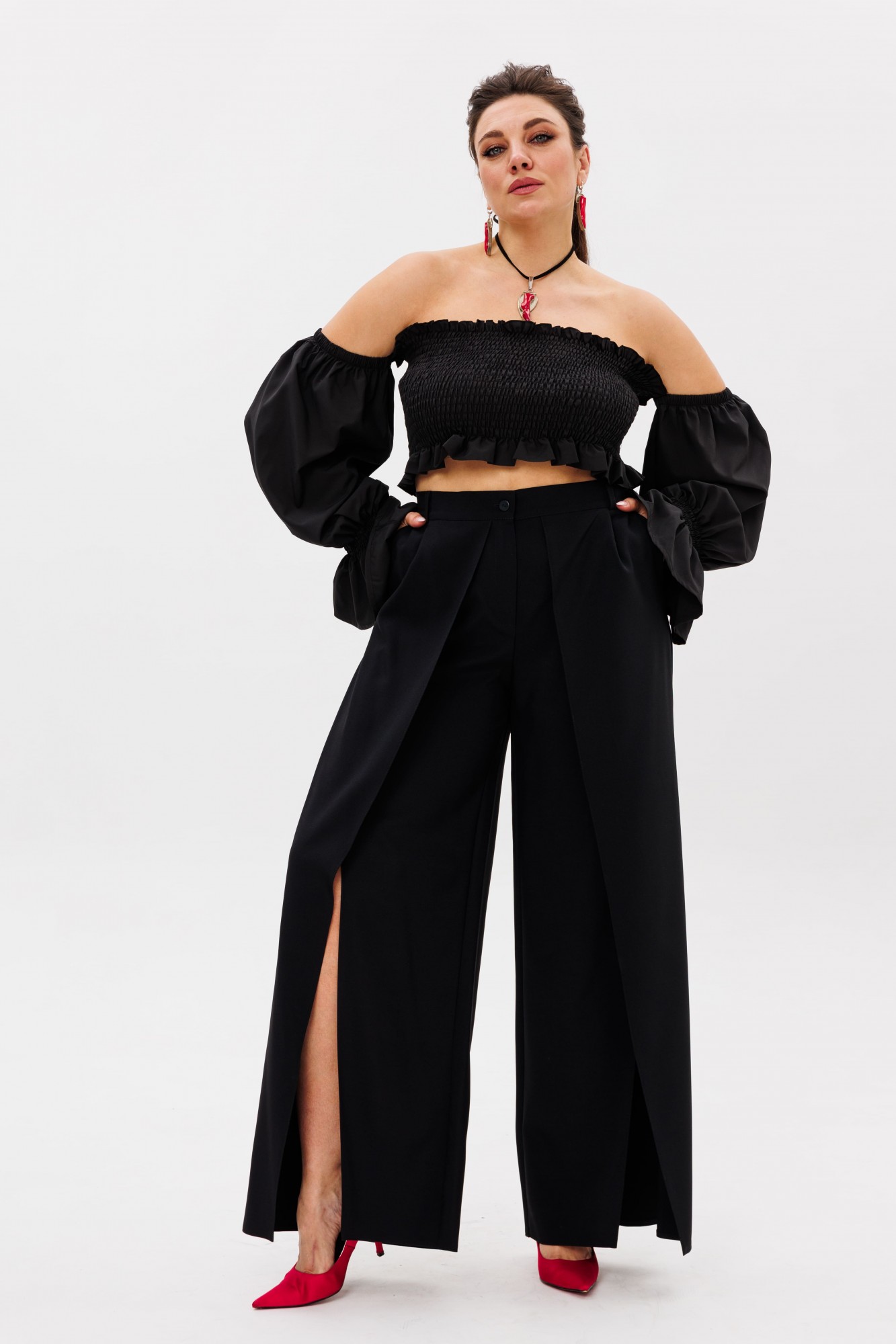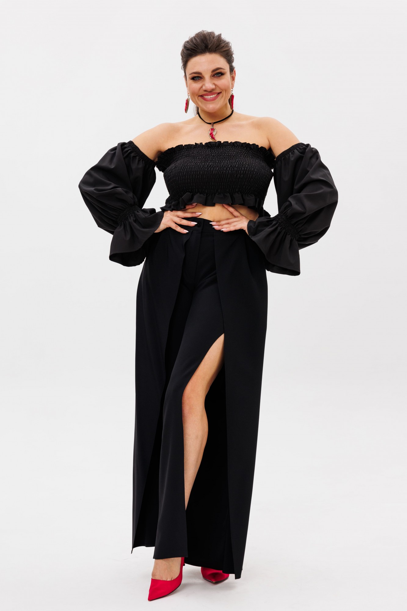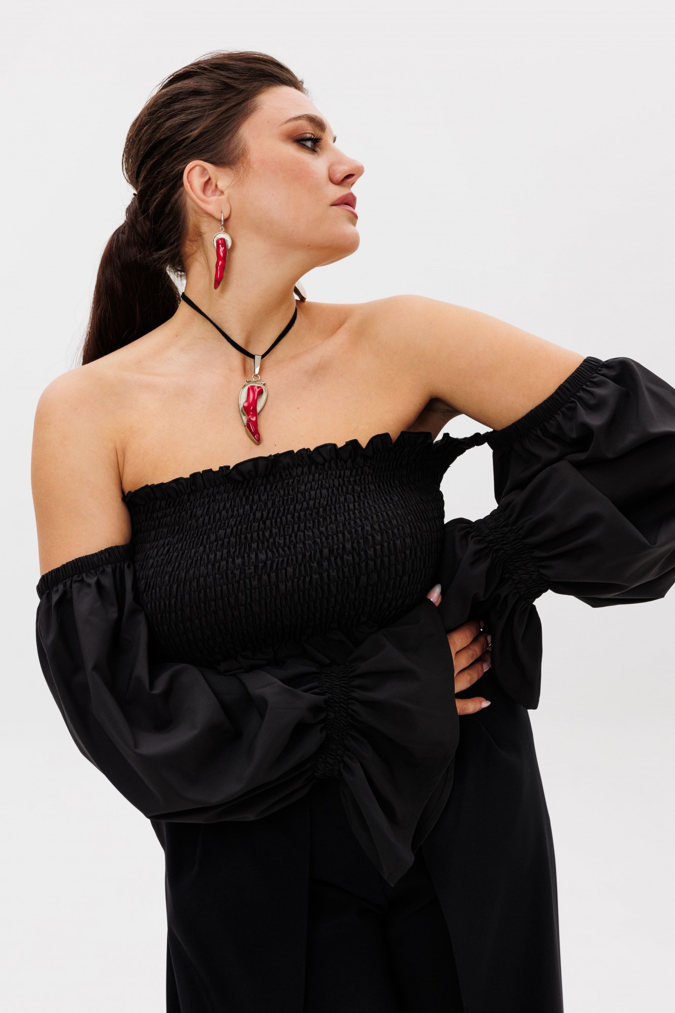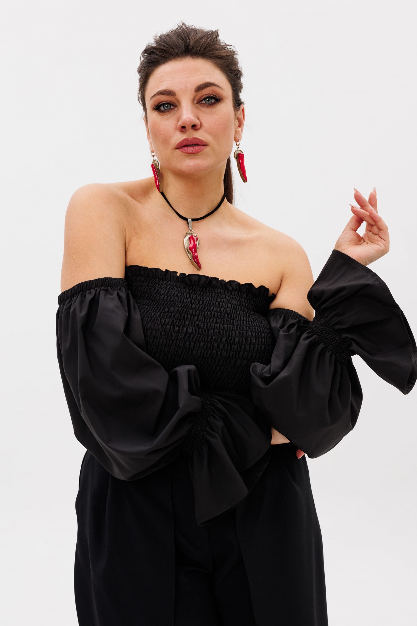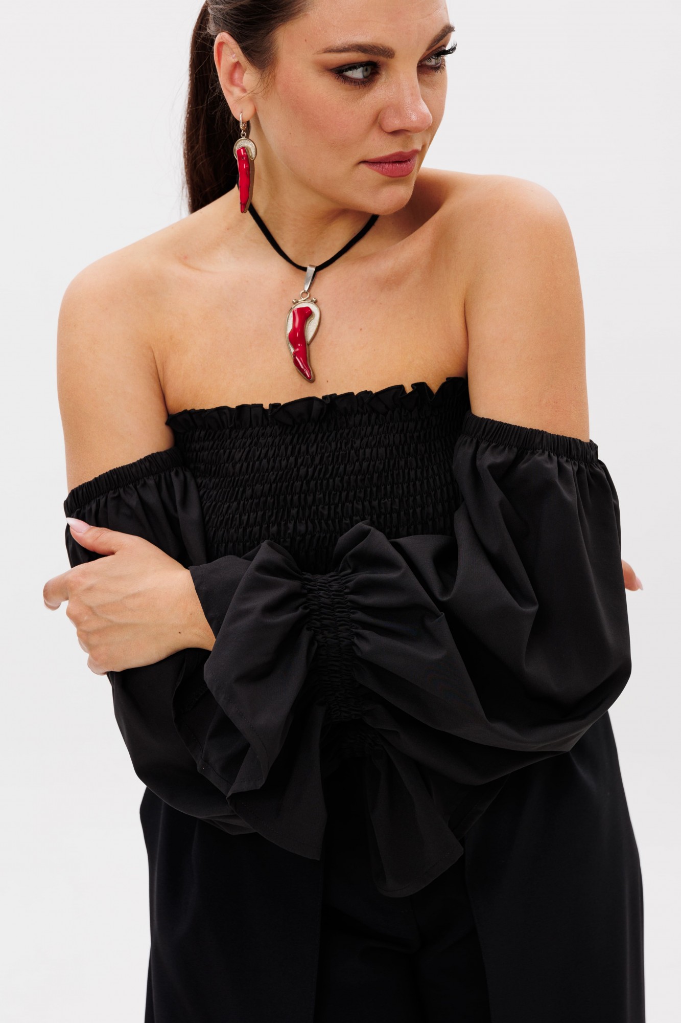 Эффектные сборчатые рукава можно носить классически на плечах или спустить их, создав соблазнительный образ с загадочным акцентом на зоне декольте.