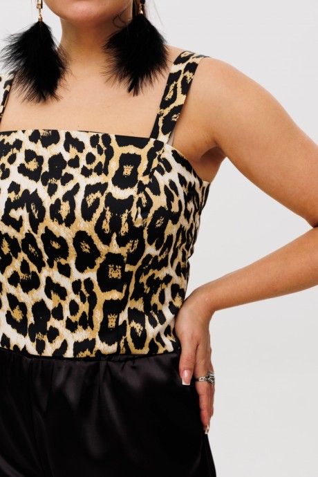 На модели в топ цвета «лео» юбка 1291, брюки 1425.1, черная рубашка 1203 и болеро 1445.