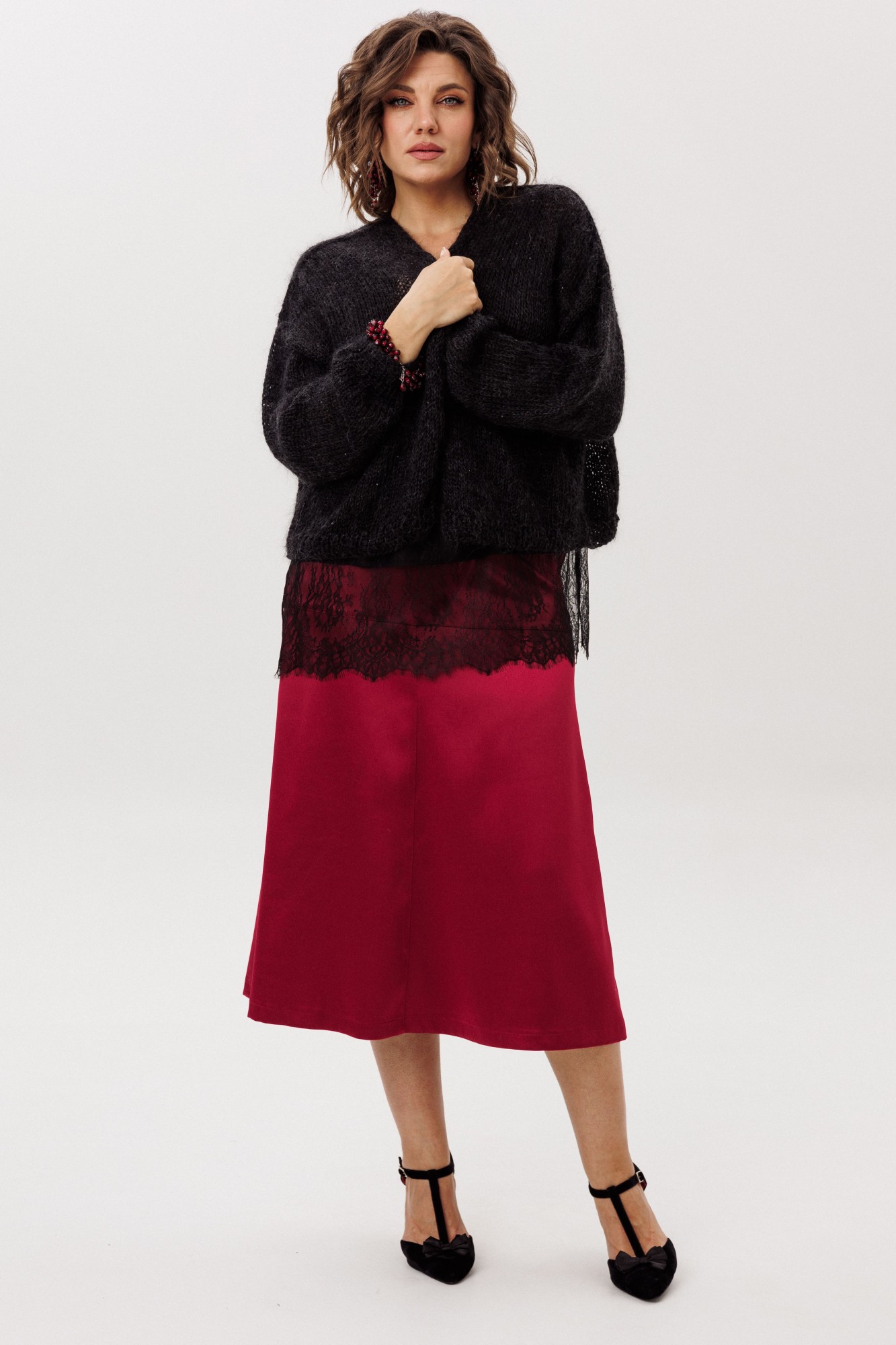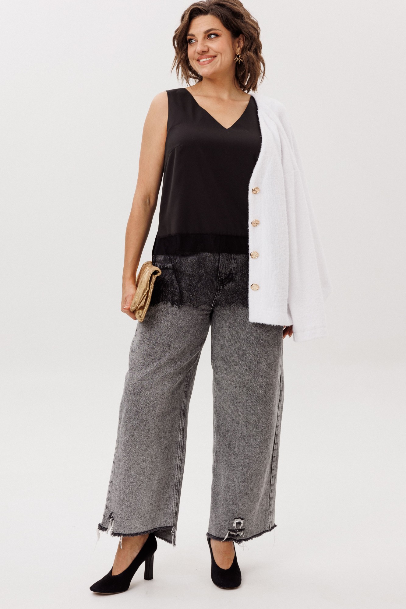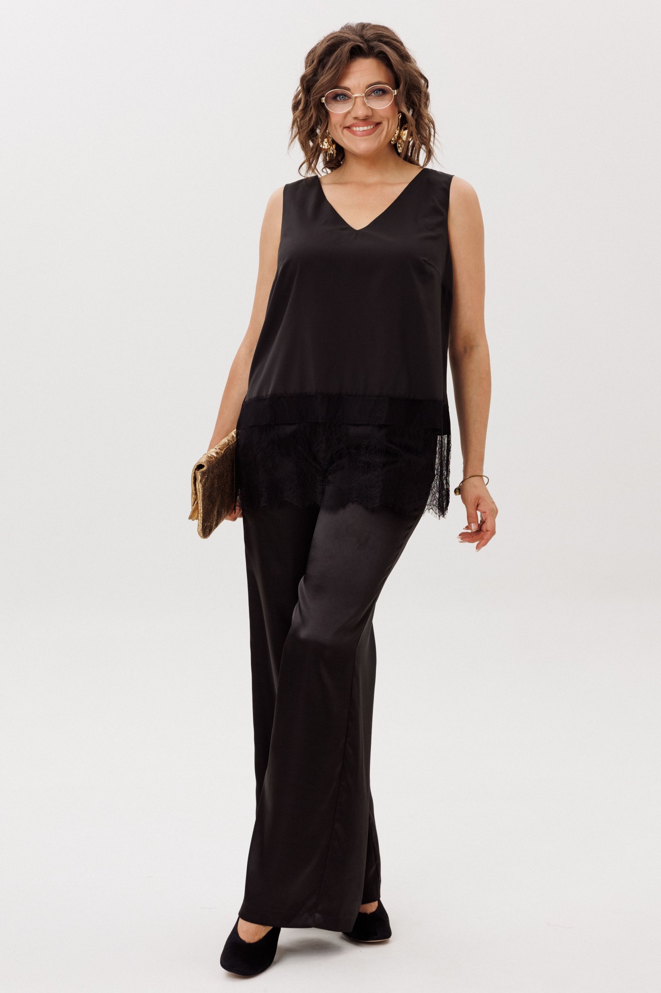 Этот топ от Анелли — искусство быть неотразимой в любой момент. Его прямой силуэт служит идеальным фоном для изысканной игры деталей. Глубокий V-образный вырез мягко обрамляет линию шеи, придавая образу элегантную чувственность, а по бокам тонкие разрезы подчеркивают свободу и грацию движений. Но настоящая поэзия скрыта внизу: великолепное кружево, окаймляющее край, добавляет ноту романтики и загадочности. Он создан для того, чтобы его носить и как изюминку образа, кокетливо выглядывающую из-под строгого жакета или уютного свитера, и как самостоятельный акцент для особого случая. Это та самая вещь, что стирает границы между повседневной легкостью и вечерним шиком, делая каждый ваш день немного прекраснее. На модели в топе цвета «черный лед» атласные брюки 1737, юбка 1510, жакет 1661 и белая рубашка 1203.1.