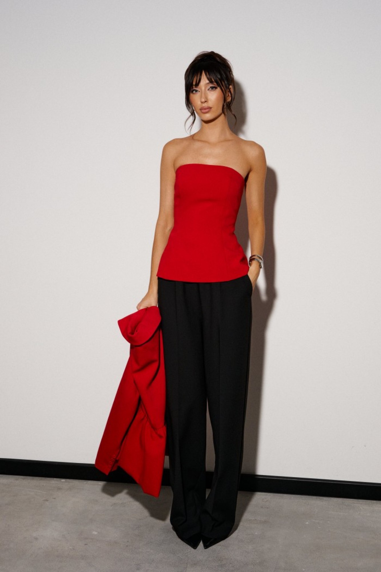Корсет прилегающего силуэта из костюмной ткани красного цвета. Характеристики: прилегающий силуэт, брендированная подкладка, прямой вырез горловины, по передней и задней части изделия прошиты строчки, по заднему полотну в среднем шве потайная молния.
