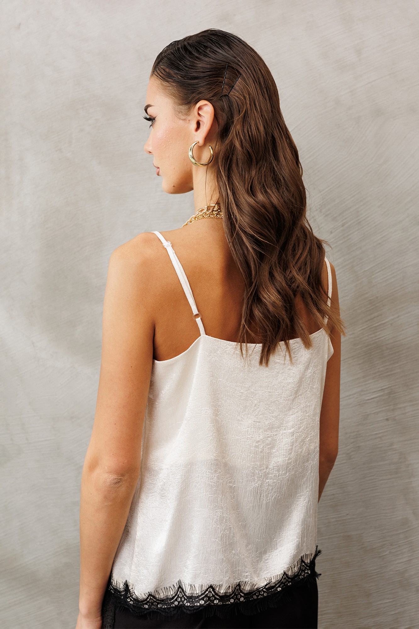 Атласная блузка-топ на регулируемых бретелях прямого силуэта, на широкой обтачке. Полочка с V-образным вырезом и нагрудной вытачкой. По низу блузки кружево.