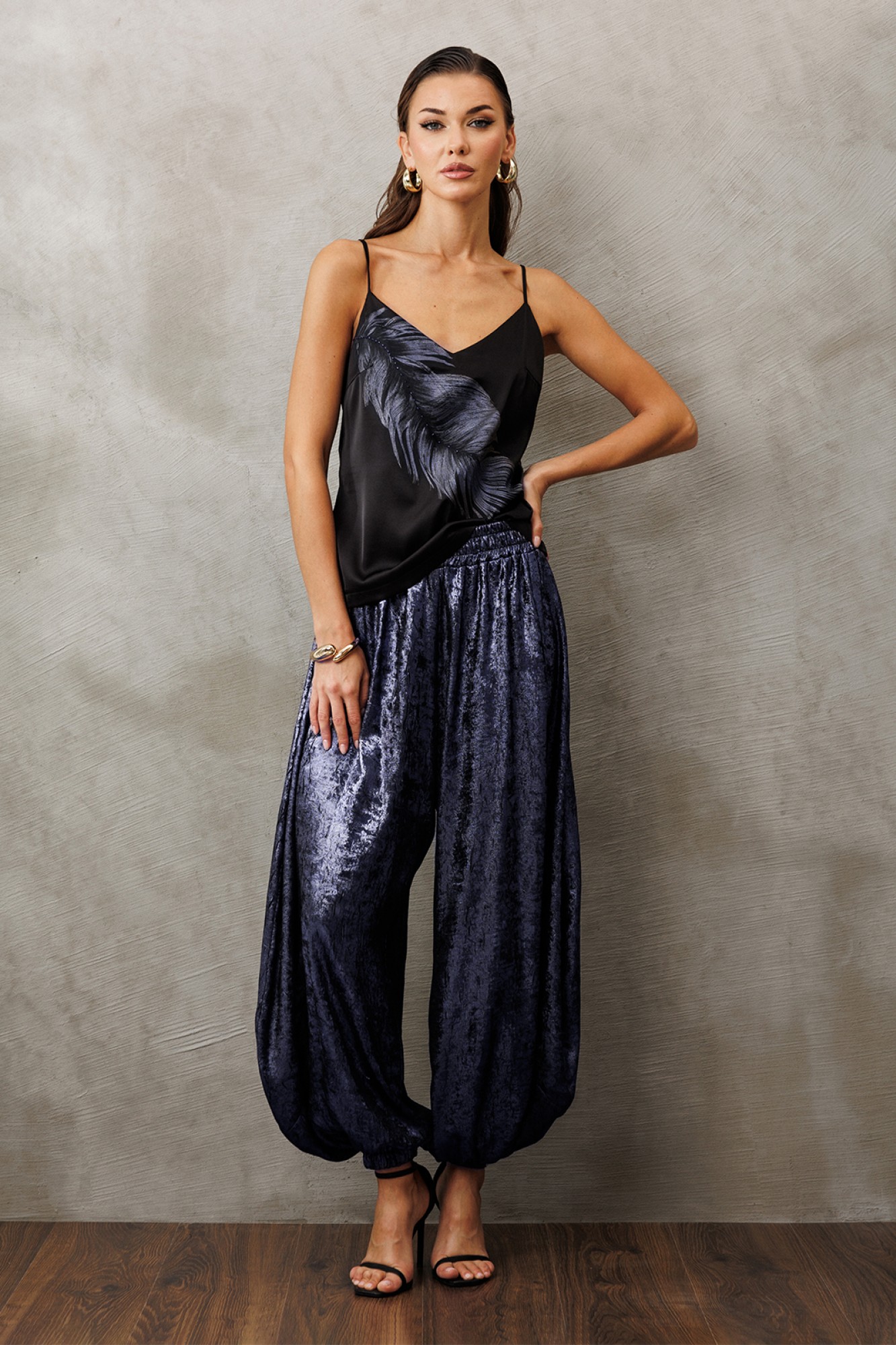 Атласная блузка-топ на регулируемых бретелях прямого силуэта, на широкой обтачке. Полочка с V-образным вырезом и нагрудной вытачкой, и печатью "Перо", и вышивкой бисером.