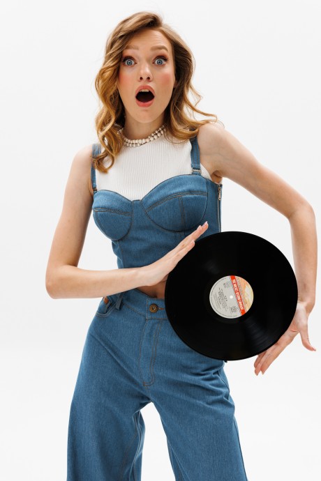 Топ выполнен из джинса, в виде корсета. Спереди два рельефа, в них вставлен регилин. На спинке между рельефами эластичная вставка для лучшей регулировки по объёму. В левом боковом шве застежка на молнию. Топ на подкладке и со съемными бретелями.