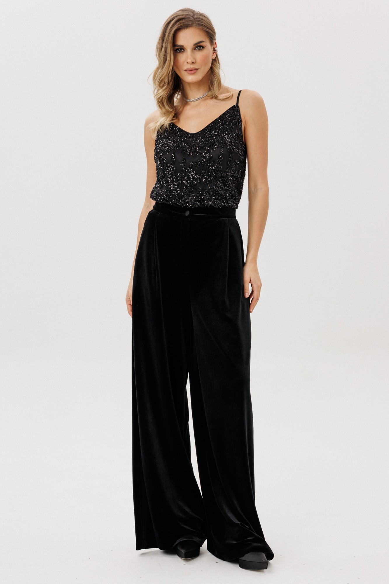Топ выполнен из сетки с вышивкой пайетками. Топ прямого силуэта, длиной выше линии бедер. Топ на отлетной по низу трикотажной подкладке. Бретели регулируемые по длине.
