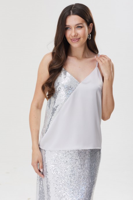 Женский топ на бретелях, полуприлегающего силуэта, с фигурным вырезом, из струящейся ткани, комбинированной тканью с пайеткой.