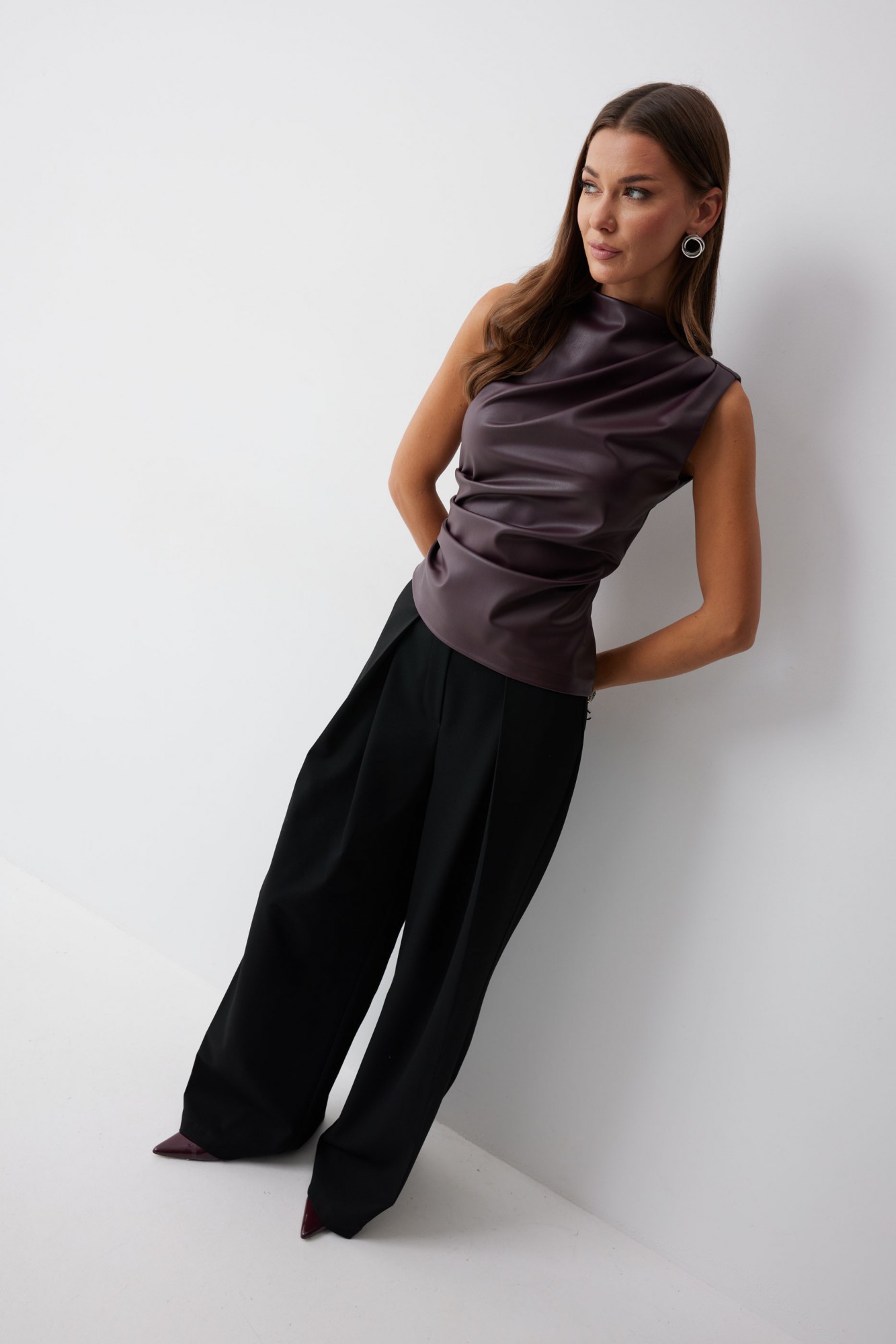 Блуза прилегающего силуэта из экокожи с ассиметричным низом. Горловина с цельнокроеной стойкой. По переду декоративные складки, выходящие из плеча и бокового шва. На спинке в центральном шве потайная молния и таллиевые вытачки.