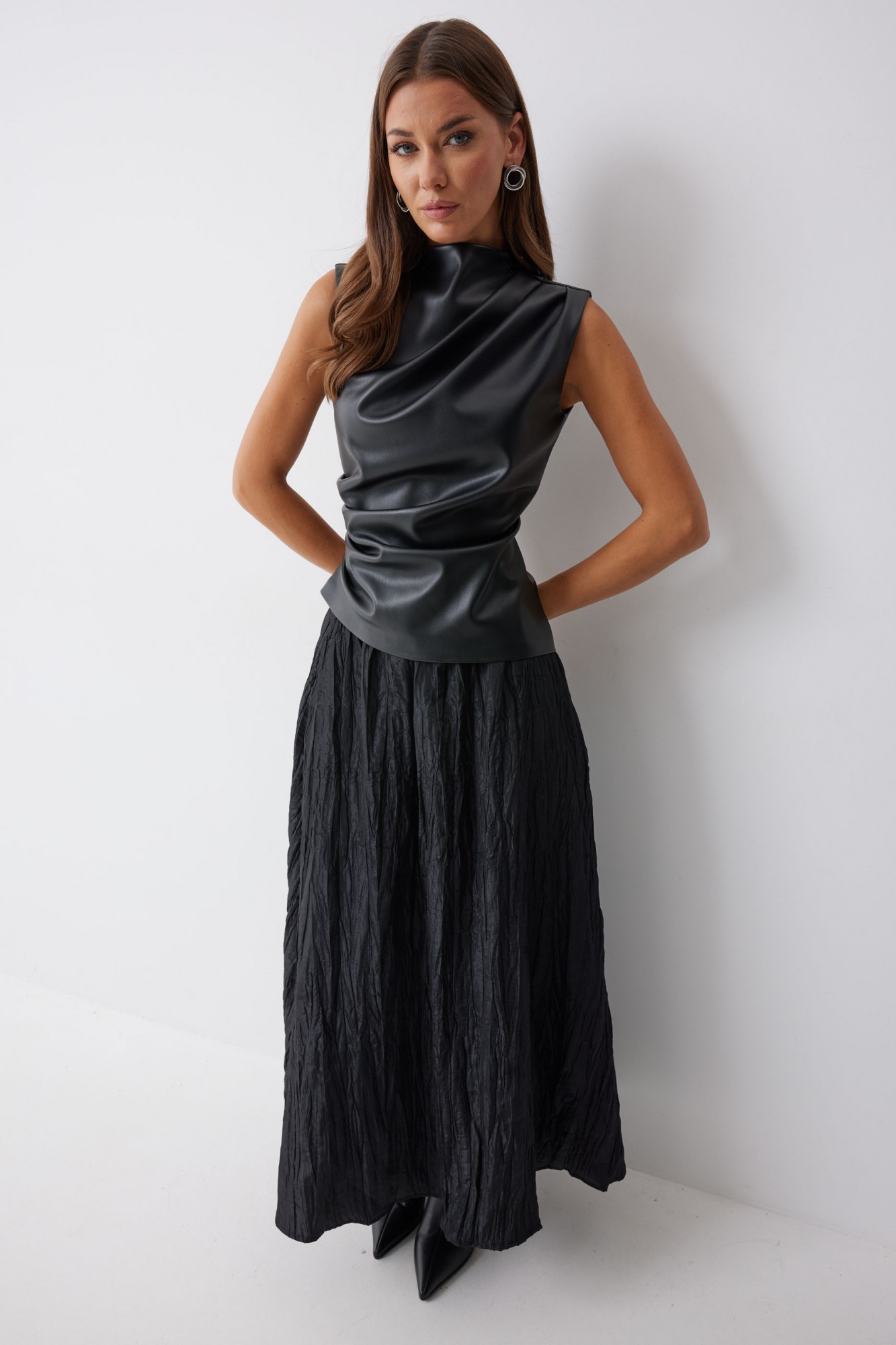 Блуза прилегающего силуэта из экокожи с ассиметричным низом. Горловина с цельнокроеной стойкой. По переду декоративные складки, выходящие из плеча и бокового шва. На спинке в центральном шве потайная молния и таллиевые вытачки.