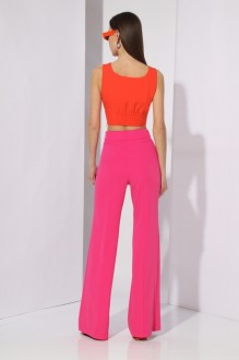 Топ выполнен из отделочной ткани, короткий, открытый, "V" - образный вырез по переду на запах, рельефы по переду, по низу – планка. По спинке – вытачки в центральной части, по низу планки расположена резинка (в притачной ткани). Отделкой комплекту служат пуговицы, отделочные строчки, шнур кулисы.