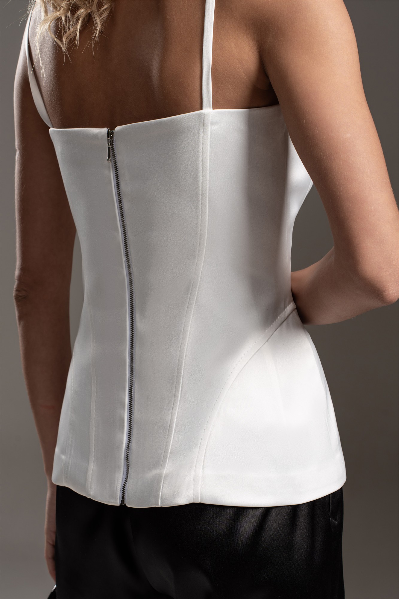Удлиненный корсет из шелковистой ткани с деликатным сатиновым блеском. Корсет на бретелях. Застежка - разъемная металлическая молния в центральном шве спинки. Объемный крой на бедрах подчеркивается выверенными конструктивными линиями. Силуэт "песочные часы" подчеркивает женственность.