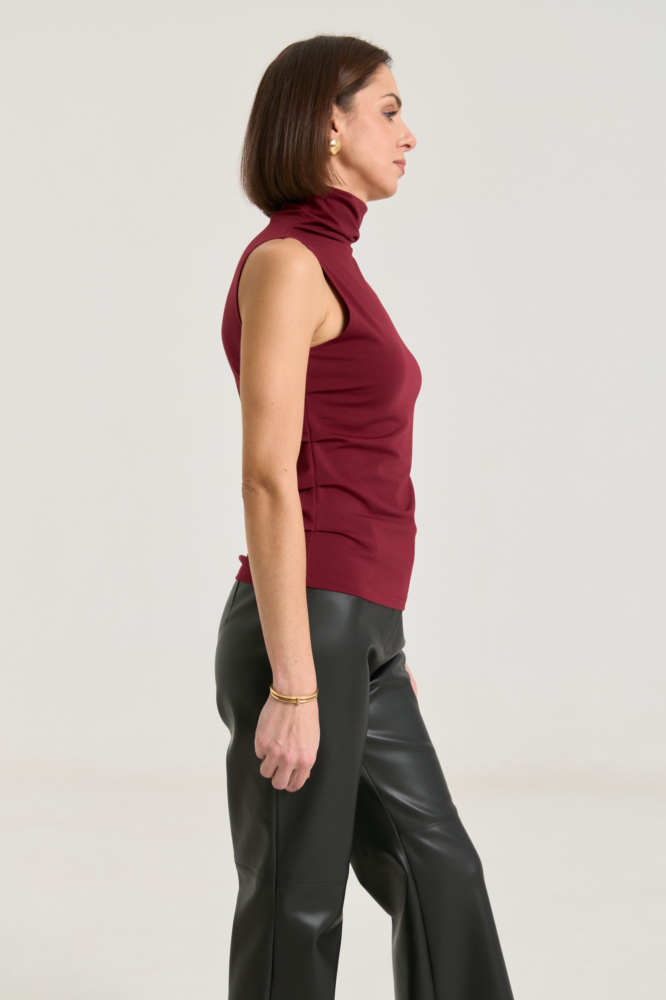 Джемпер выполнен из трикотажной ткани премиального класса, ткань плотная, мягкая, не просвечивает. Горло цельнокроеное высокое, за счет этого можно его драпировать либо носить с подворотом, по бокам защипы, что придает фигуре стройности, за счет красивых линий складок.