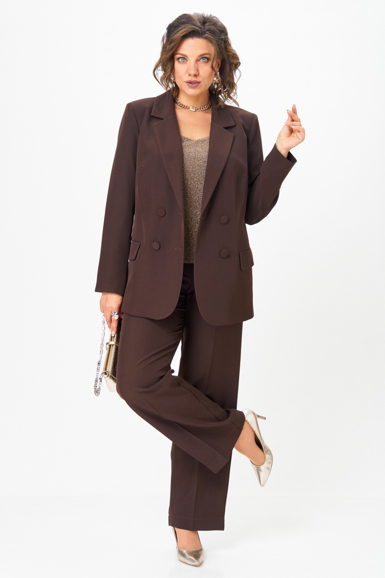 Топ прямого силуэта на широких бретелях, выполнен из трикотажного полотна с люрексом. Перед с нагрудными вытачками. Горловина переда лёгкой V-образной формы. Спинка цельнокроеная.