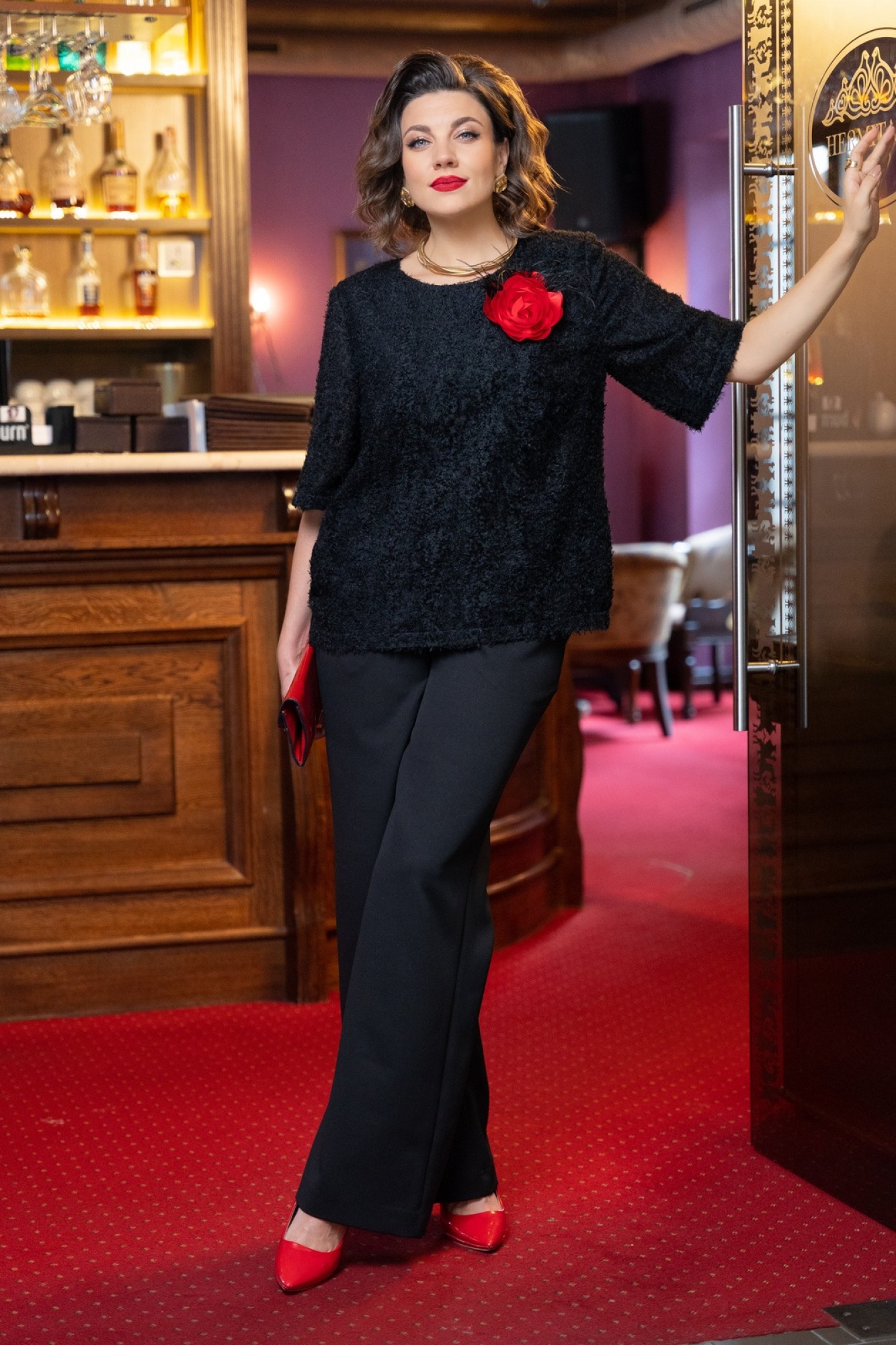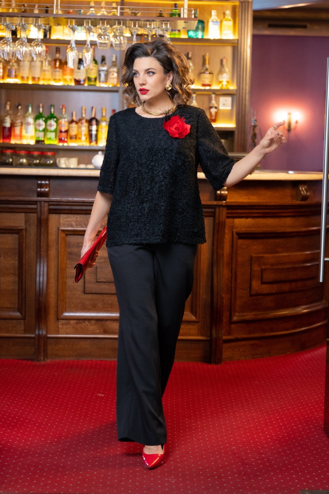 Топ прямого силуэта с естественной линией плеча. По переду выполнены нагрудные вытачки. Горловина округлой формы. В горловине спинки выполнен вырез "капля" с застёжкой на навесную петлю и пуговицу. Верхний слой топа выполнен из полотна с "ресничками". Нижний слой топа - из трикотажной подкладки. Рукав длиной до линии локтя.
