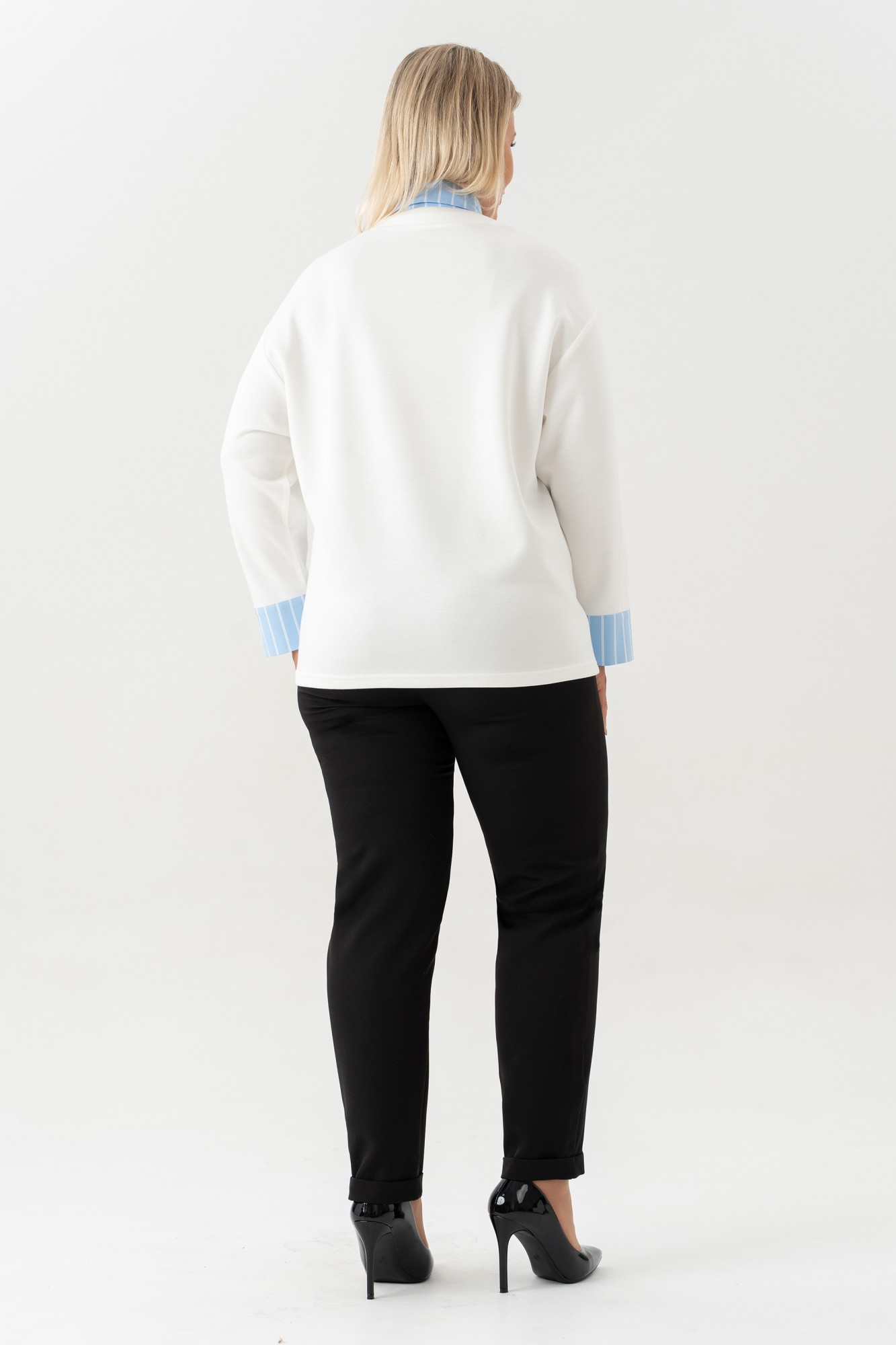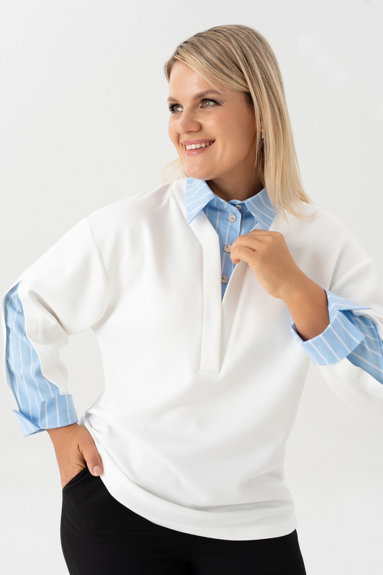 Практичный и удобный – он станет Вашей любимой туникой, а трендовый дизайн делает его актуальным решением для девушек, которые следят за модой. Свитшот женский с имитацией рубашки- новинка коллекции. Изготовленный из качественного трикотажа и полоски на х/б основе, он обеспечивает дышащие свойства и гипоаллергенность, что особенно важно для женщин с чувствительной кожей. Подходит на осень, весну и для зимы. Ткань необычайно мягкая и приятная к телу. Свободный оверсайз крой изумительно подойдет для девушек и женщин больших размеров. На свитшоте обработан воротник и застежка –планка на петли и пуговицы. Рукав комбинирован из двух тканей, с манжетой и разрезом. Модель подходит для высоких и для невысоких. Такая модель должна быть в каждом гардеробе.