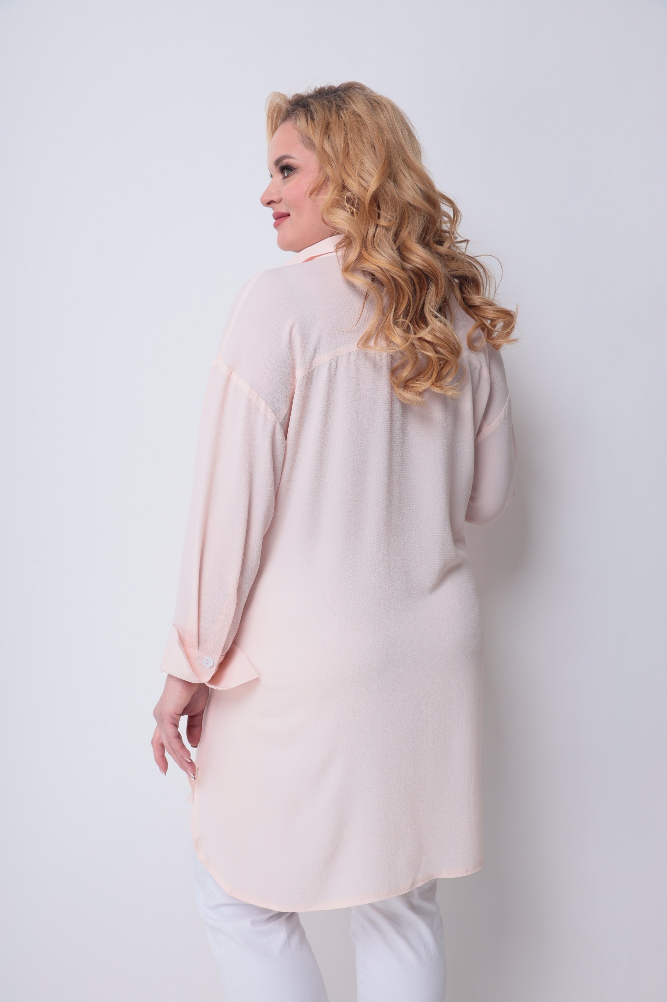 Удлинённая блузка выполнена из шифоновой ткани, которая делает изделие струящимся. Нежная расцветка хорошо вписывается как в классический, так и спортивный гардероб. Спинка удлинена по отношению к переду. Приспущенный рукав с широкой отгибающейся манжетой на пуговице, рубашечный воротник и V-образный вырез делают блузку универсальной и модной. Изделие хорошо сочетается с брюками, джинсами, а также босоножками на каблуке или кедами.