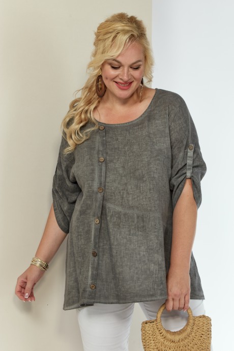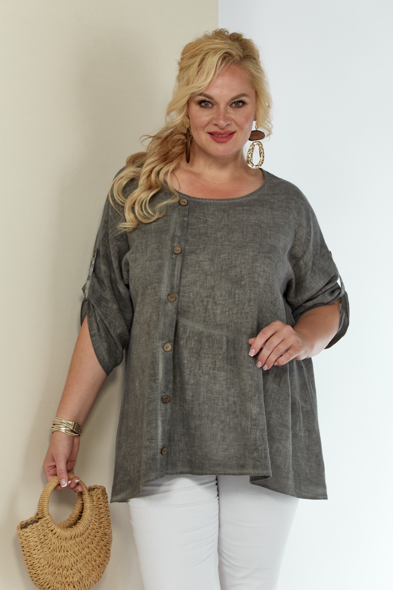 Женская льняная туника выполнена из высококачественного умягченного 100% натурального льна. Лён прошёл процедуру энзимного умягчения на производстве, поэтому туника не колется и не садится после стирки. Модель свободного силуэта к низу расширена, за счет подреза и легкой сборки по полочке. Вырез горловины округлой формы. По переду смещенная планка, декорированная пуговицами. Рукав трансформер, со спущенной линией плеча, регулируется при помощи паты и пуговицы. Спинка со средним швом.