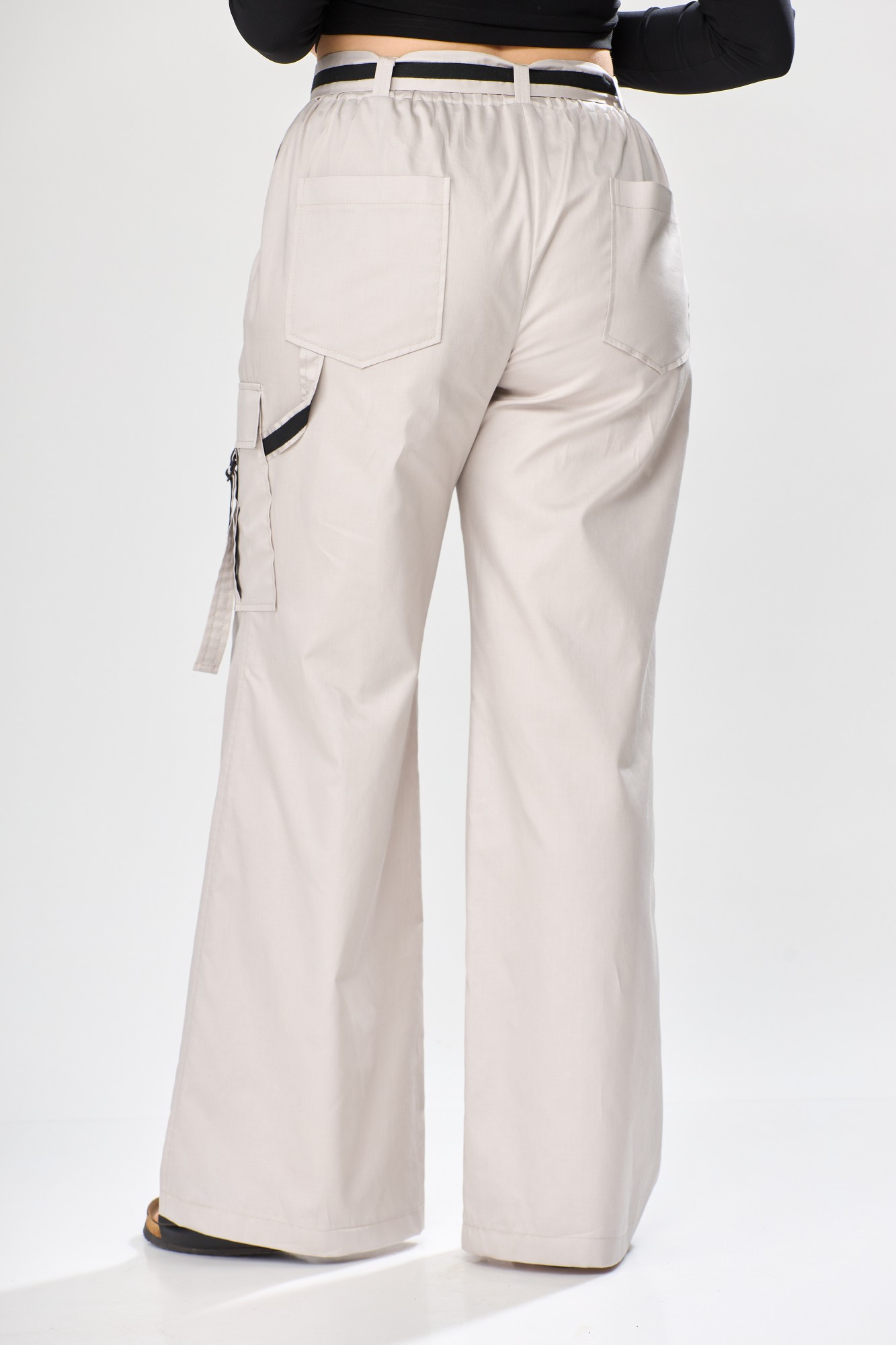 Брюки в стиле “карго” выполнены из однотонной ткани. По передним половинкам выполнены наклонные карманы. По левой передней половинке выполнен накладной карман с клапаном и хлястиком с декоративной тесьмой и застежкой на полукольца. По задним половинкам выполнены накладные карманы. Брюки на притачном поясе с эластичной тесьмой и настроченными шлевками, через которые продет пояс-ремень с застежкой на полукольца.