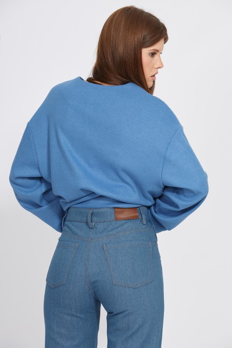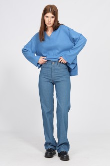Брюки выполнены из джинса. Брюки прямого силуэта, на отрезном поясе. Спереди боковые карманы с фигурным входом. Застежка спереди на молнию с гульфиком и пробивную пуговицу. Сзади накладные карманы.